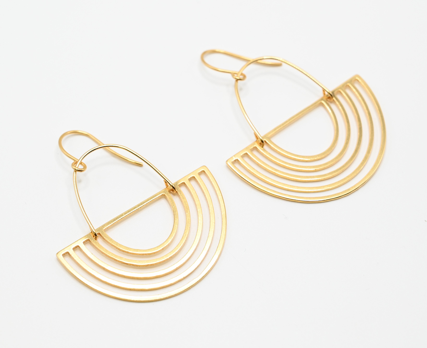Gold-Plated Sterling Silver Large Earrings in Multiple Line Fan Shape Design. These Earrings are Very Light in Weight.