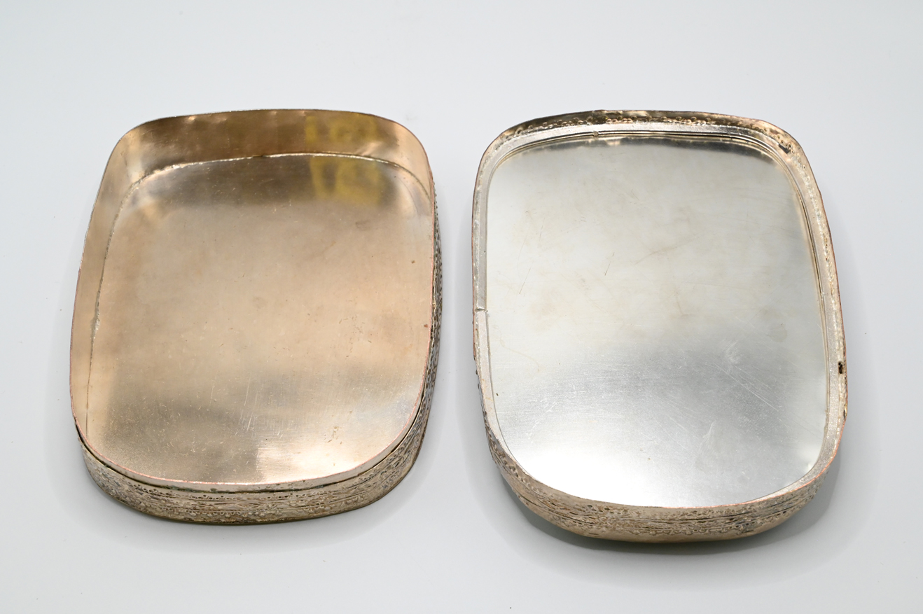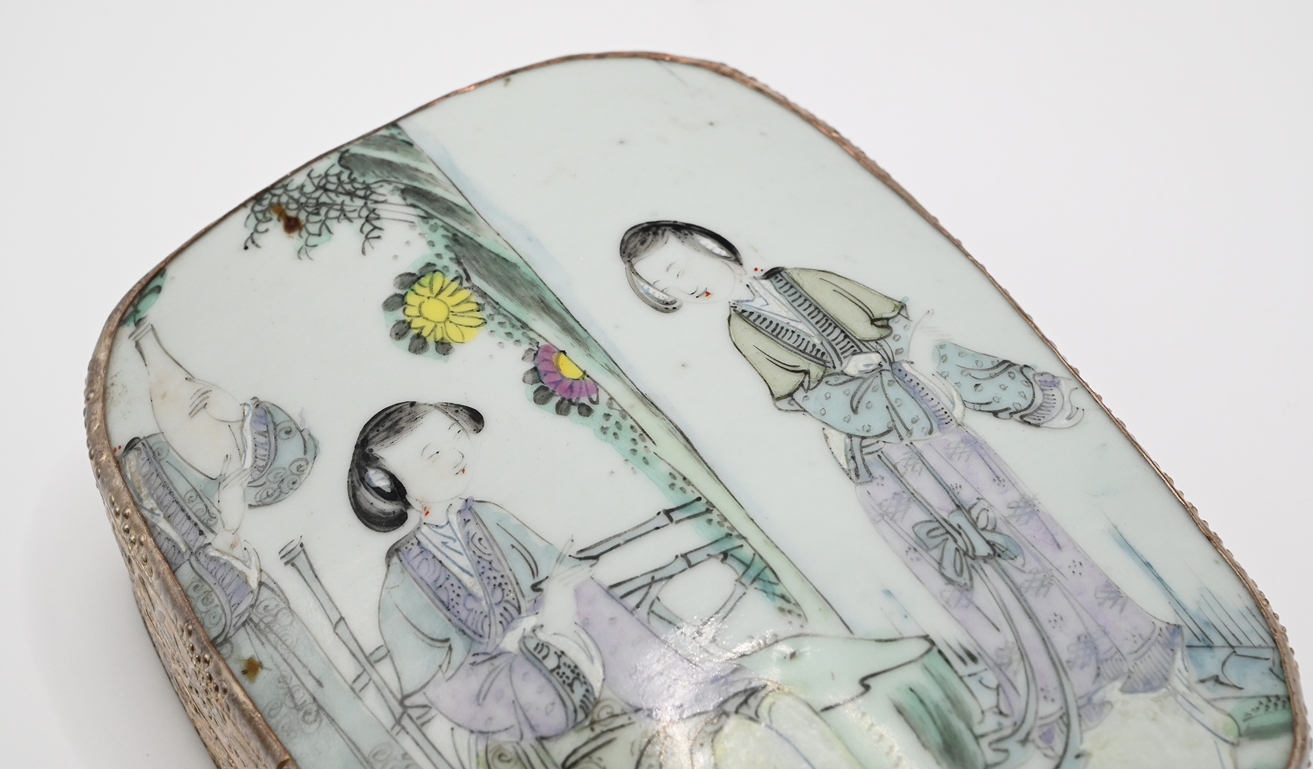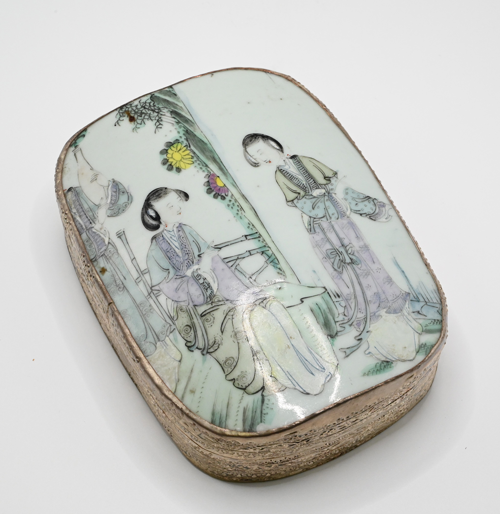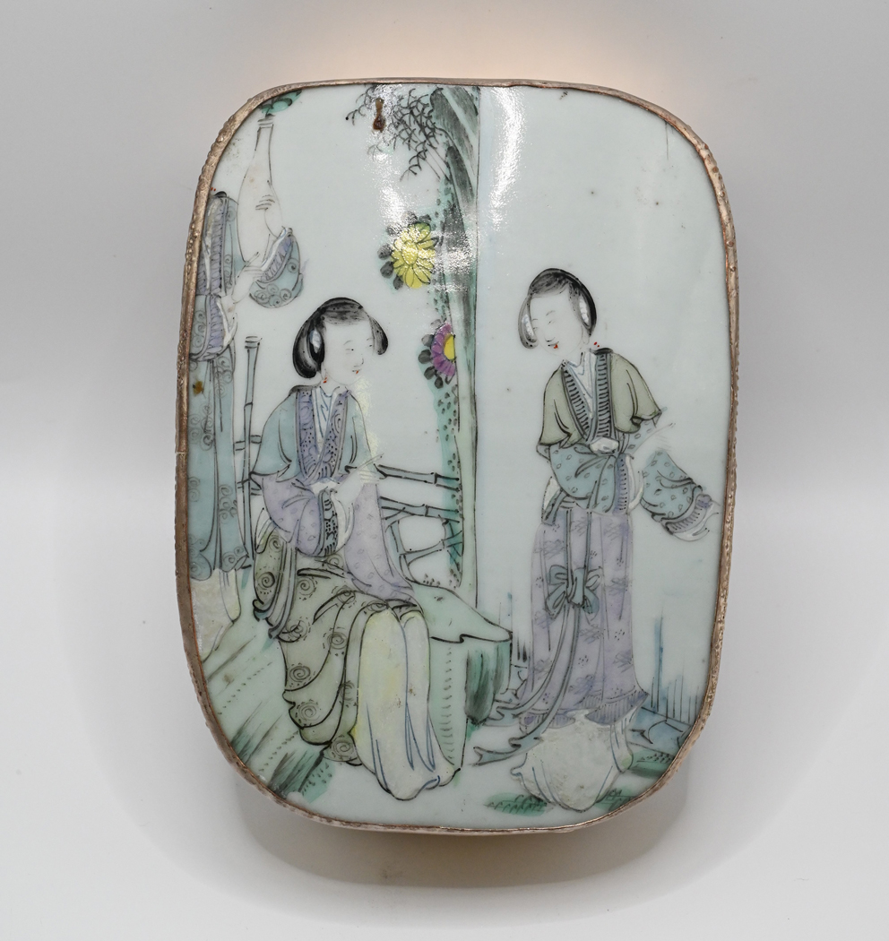 Smaller Medium Size Silver-Plated Copper Shard Box with Antique Hand-Painted Porcelain Shard with two female figures.