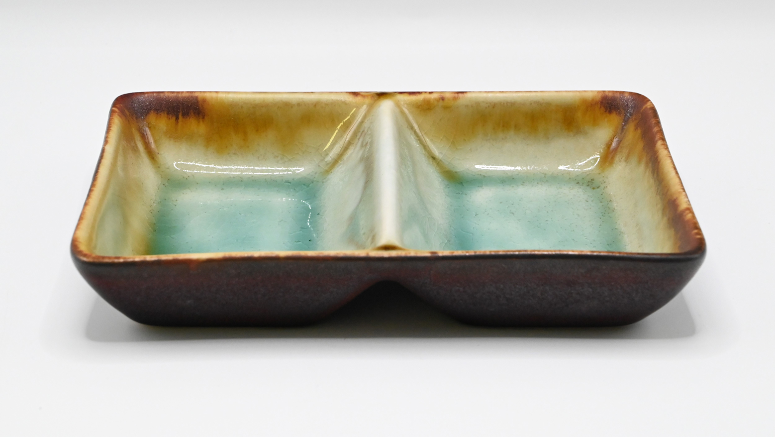 Rectangular Two-Compartment Porcelain Sauce Dish in Green and Yellow Glaze.