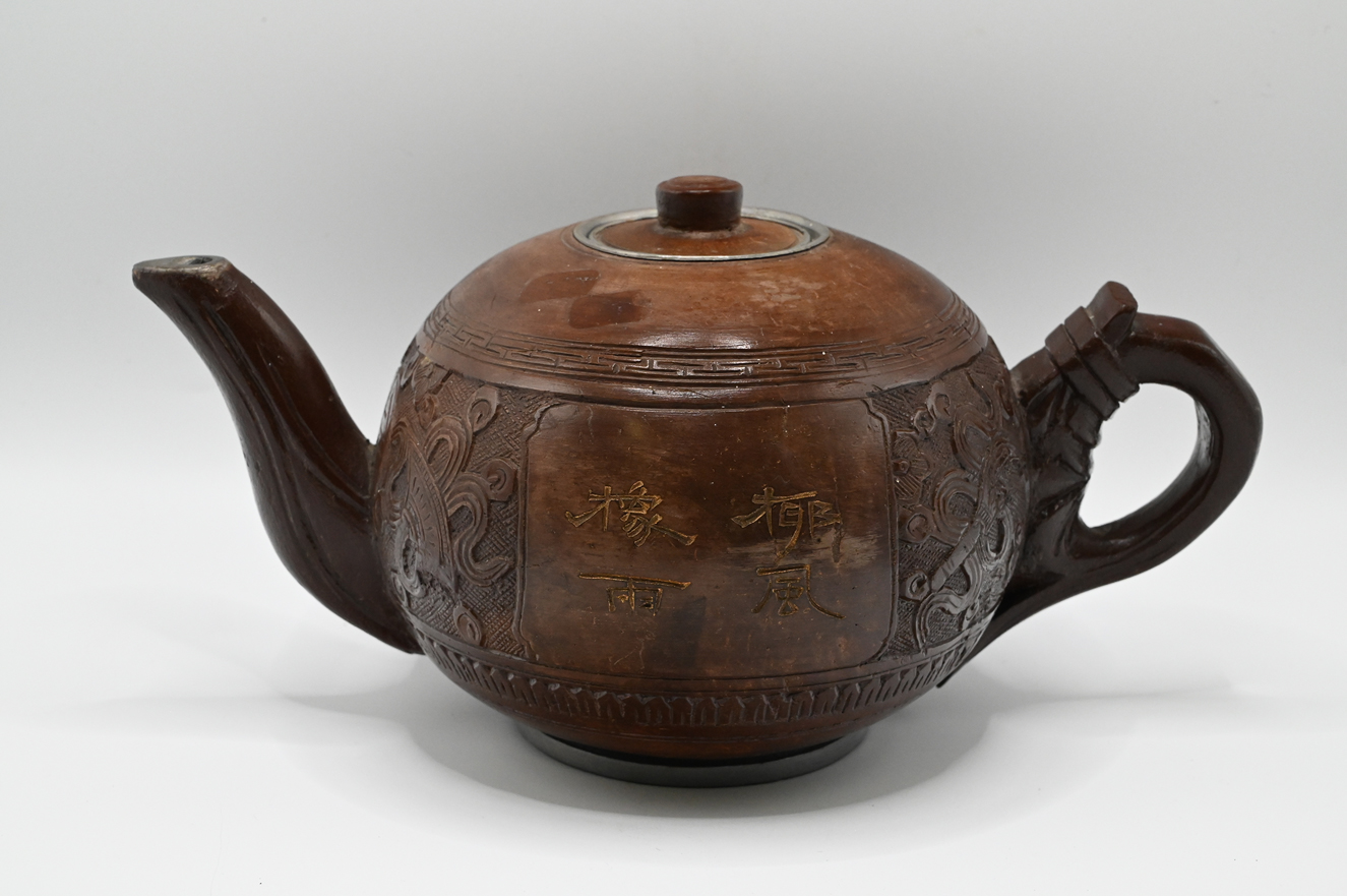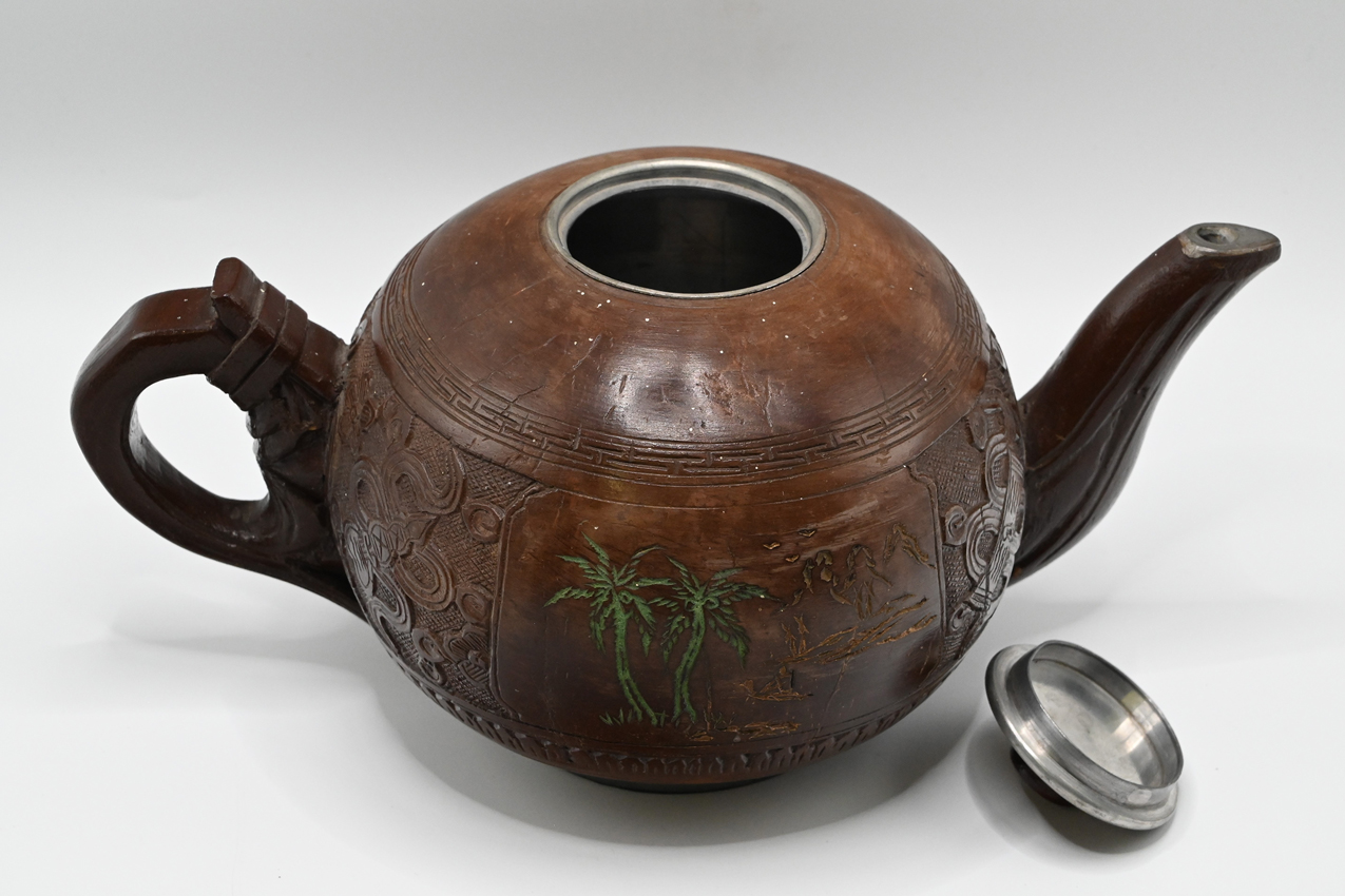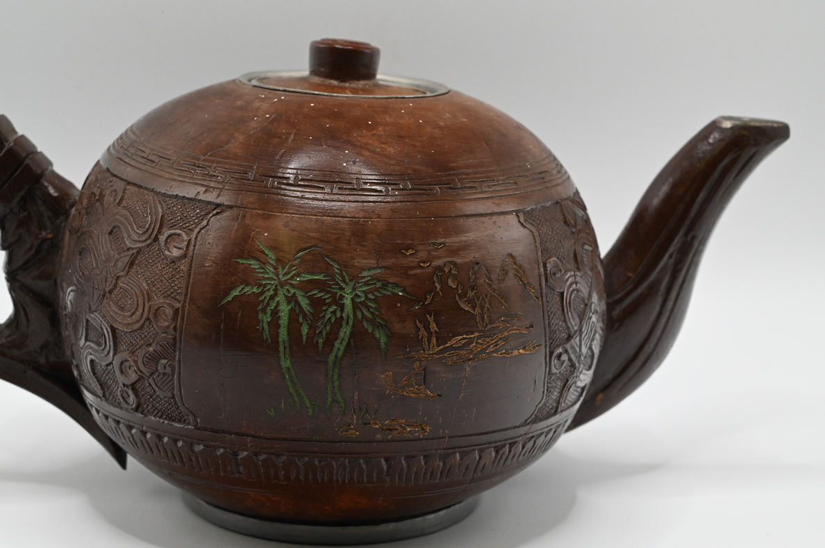 Rare Hand-Carved Old Coconut Shell Teapot with Metal Inside. Possibly a Chinese export piece for Southeast Asian market. The body and the lid of the teapot is hand-carved with a whole coconut shell with ribboned temple objects and some calligraphy. Coconut shell is very hard and hard to carve. Estimated to be from the first half of the 20th century.