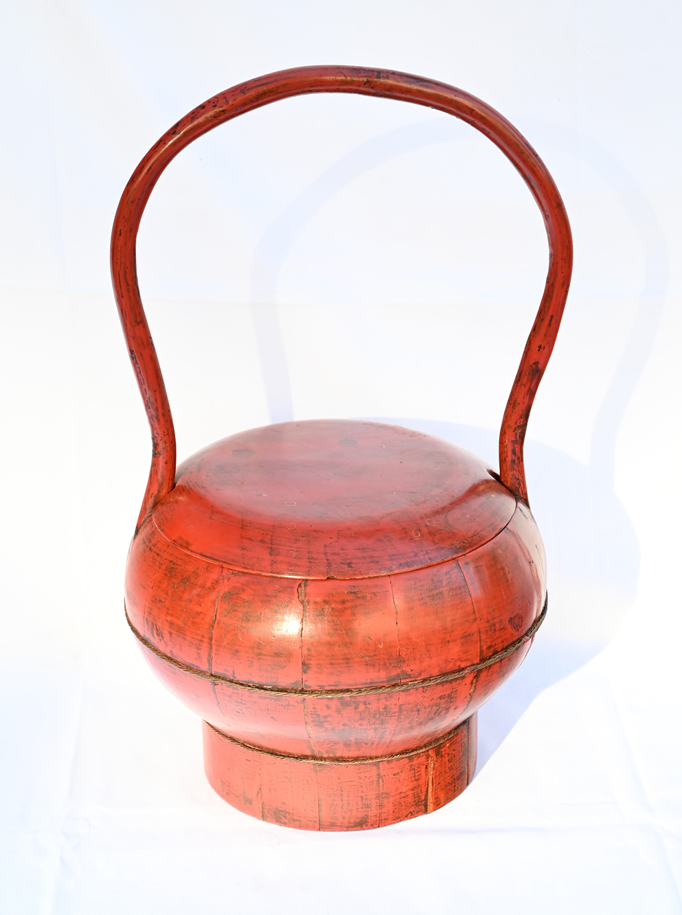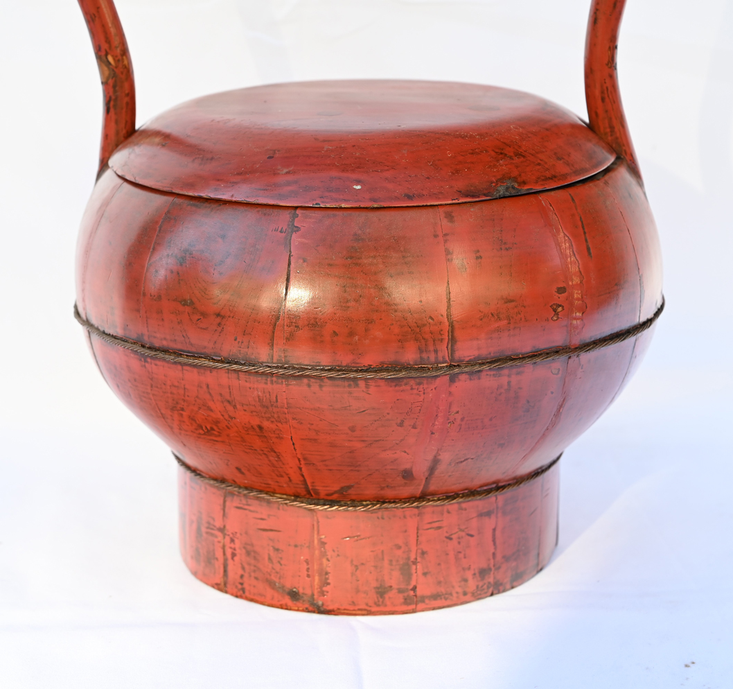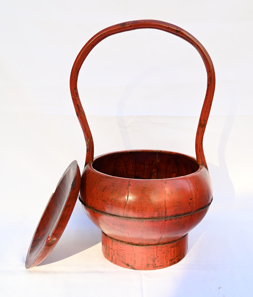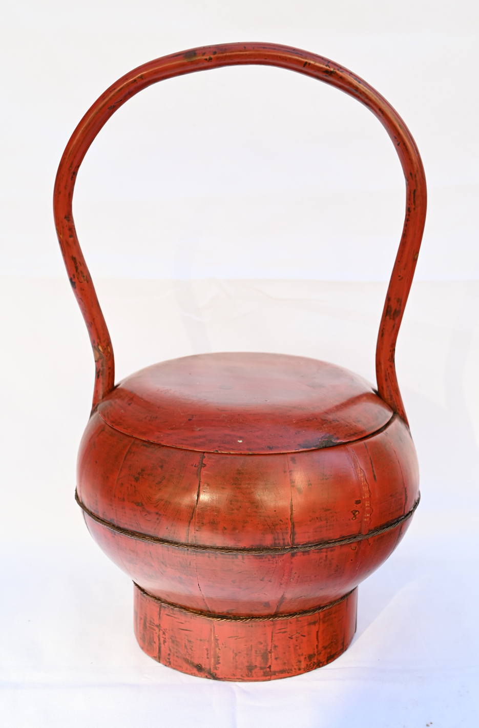 Antique Ningbo Style Red Lacquer Wedding Wooden Bucket with Lid and High Handle. This is a prime example of this type of wedding basket with good original red lacquer well refinished with a smooth and soft glow surface.It is in excellent condition.