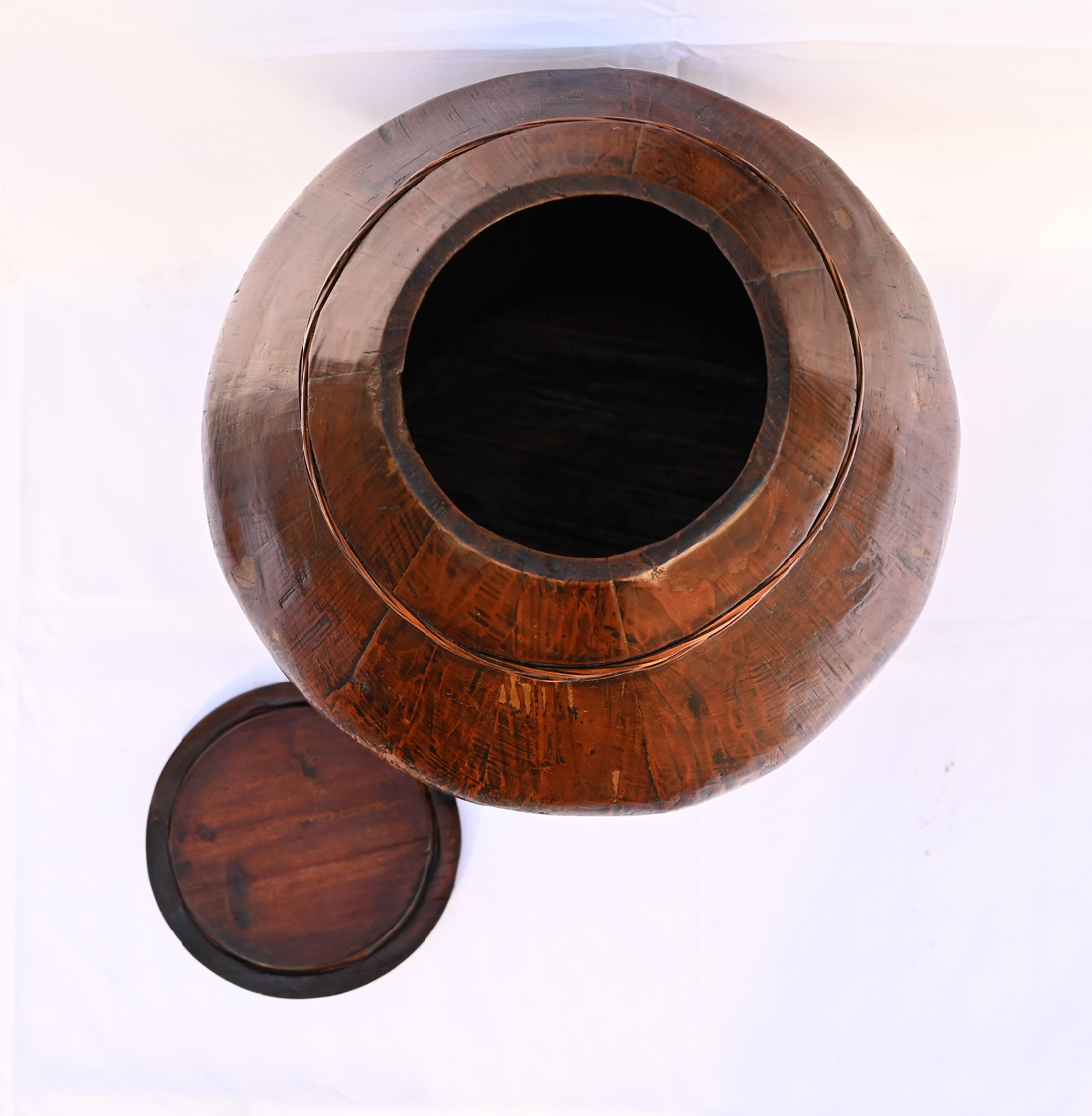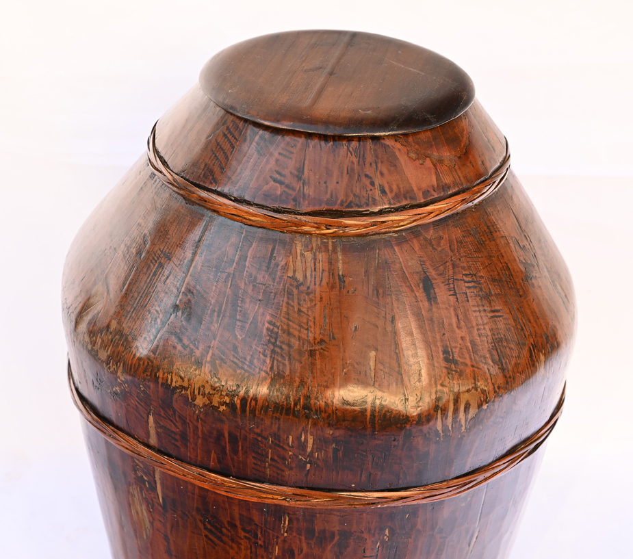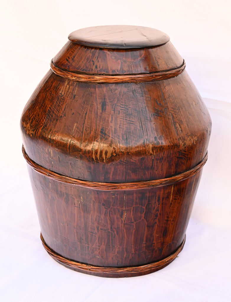 Antique Chinese Wooden Wine Storage Barrel with Bamboo Bands. This wine storage barrel is beautifully refinished in lighter wood color with soft lacquer layer on the surface. Like many other old Chinese wooden buckets and barrels, it is hand-carved in curved wooden sections and joined together with wooden pegs in between before applying the woven bamboo bands outside to further secure it. Over 100 years old.