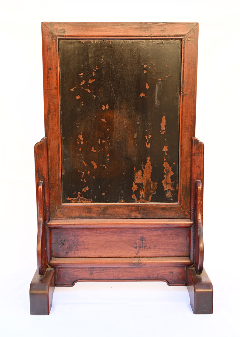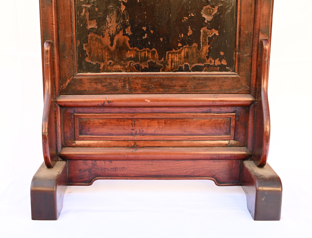 Such small screen was often used on a scholar's table to partially shield an area for the desk. One might place scholarly objects in front of the screen on the inside. For a Feng-Shui purpose, such screen might exclude unnecessary destruction and provide a mental tranquil space. From a modern interior decorating point of view, it shields an area and provides an intimate personal space. Partial repair on the frame apron. Refinished in lacquer finish. Possibly from 17-18th century.