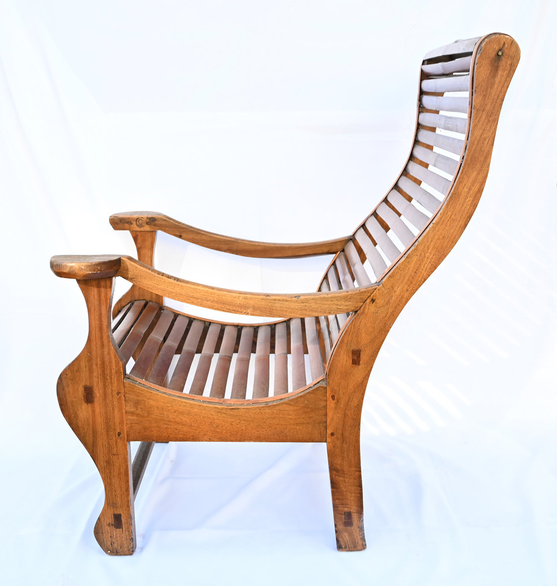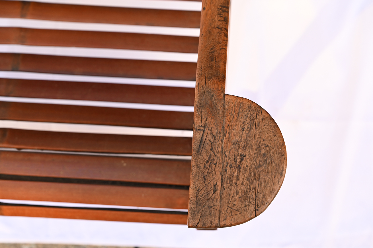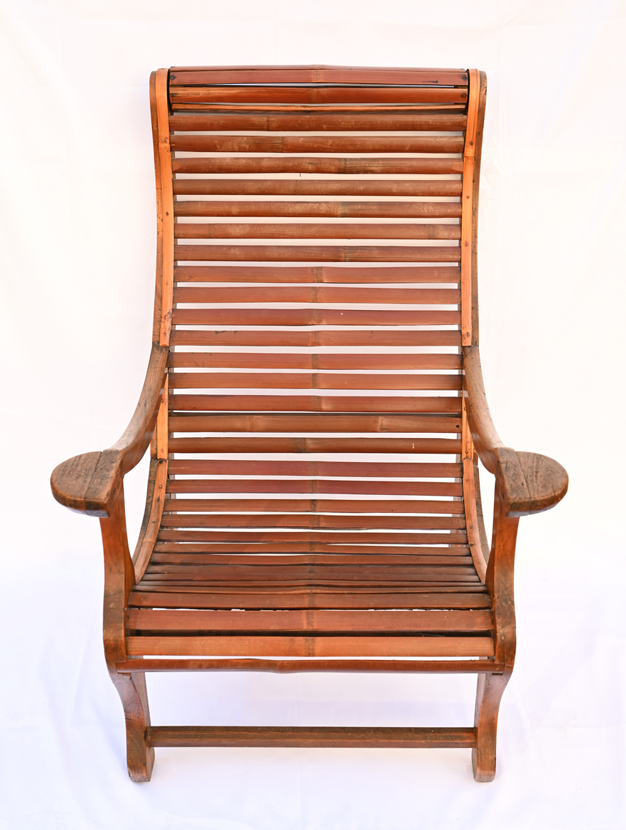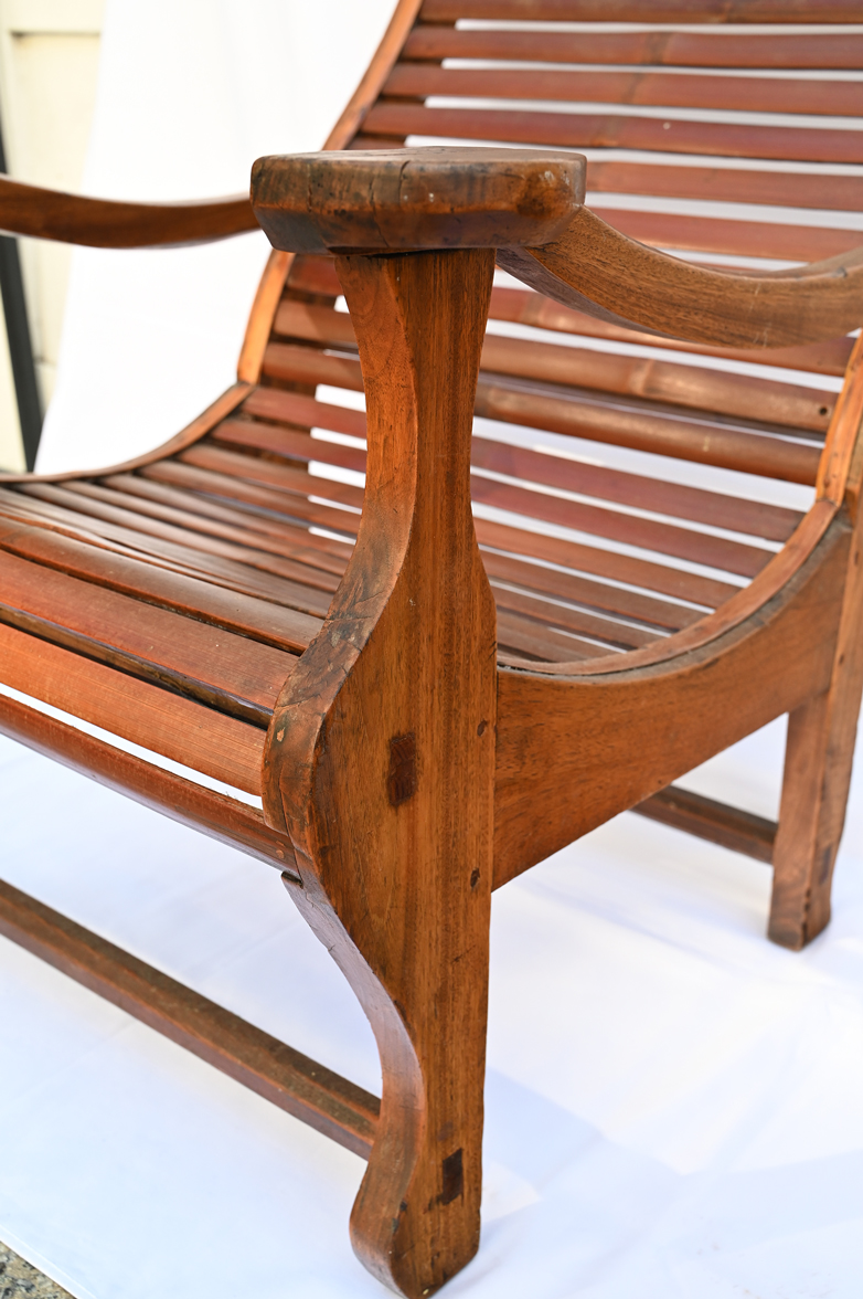 Antique Smaller Size Huali Hardwood Lounge Style Armchair with Bamboo Slats. Some repair.