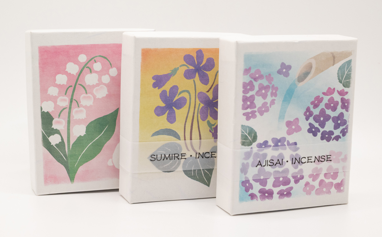 Japanese Incense with Delicate Floral Scents. Including: Suzuran (Lily Magnolia), Sumir (Violet), and Ajisai (Hydrangea). Price is for each package.