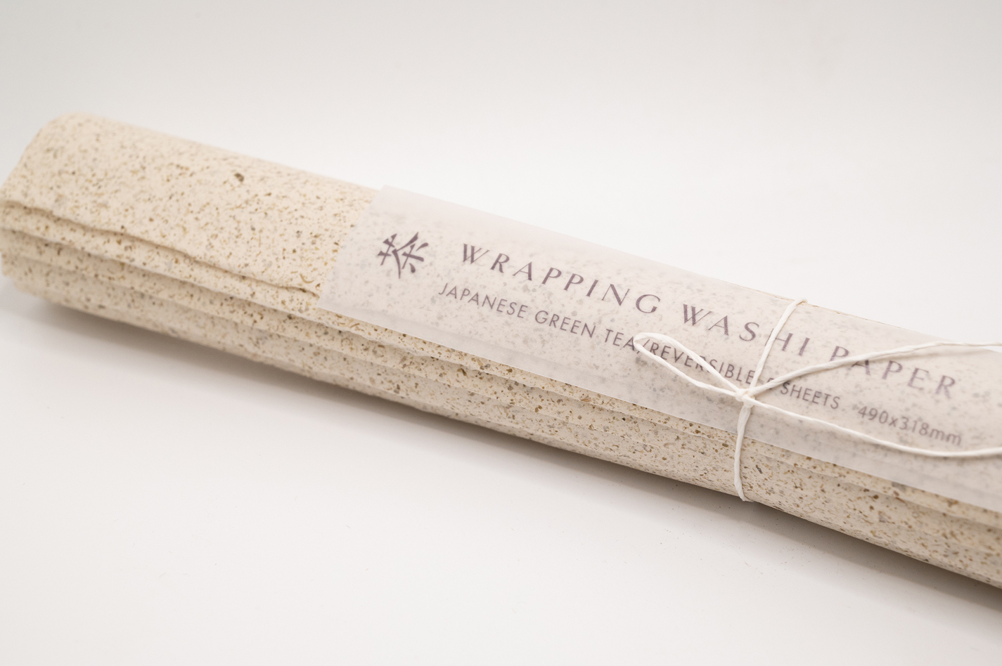 The front side is blended with a large amount of the finest tea powder, resulting in a green tea hue. The reverse side incorporates randomly cut tea leaves in smaller quantities, maintaining the natural white color of the washi and giving it a unique texture.