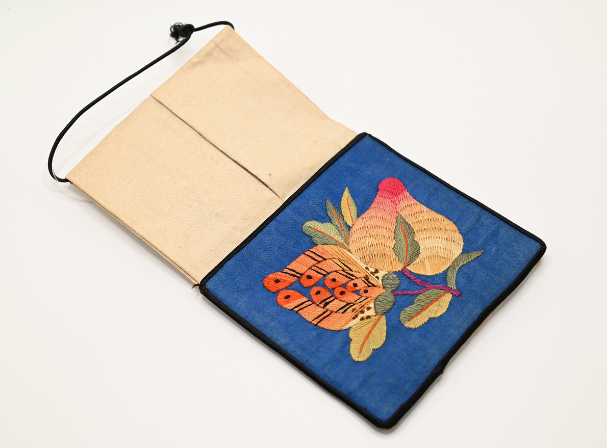 Antique Chinese Embroidered Silk Pouch with Peach and Buddhist's Hand Fruit in vivid blue color background in excellent condition. Late 19-early 20th century.