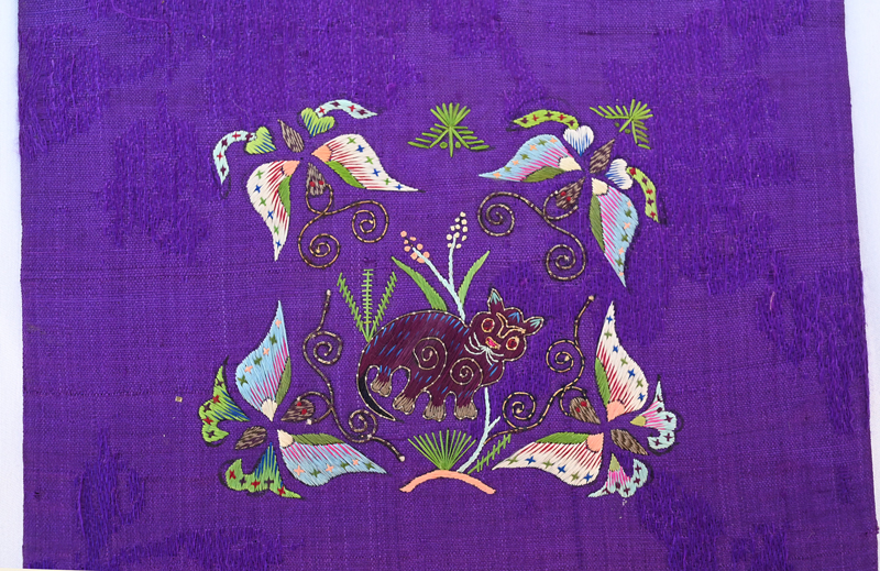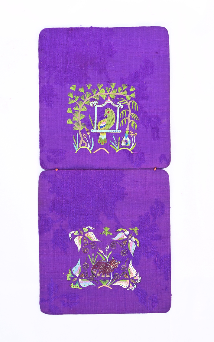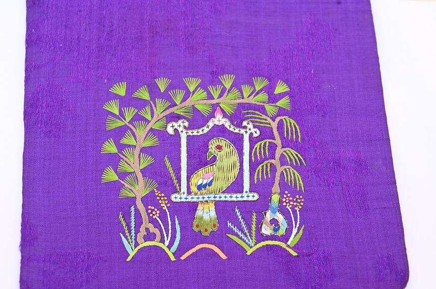A Pair of Rare Antique Embroidered Squares with Cat and Parrot in deep purple color in intricate work. In very good condition. Late 19-early 20th century. Priced and sold as a pair only.
