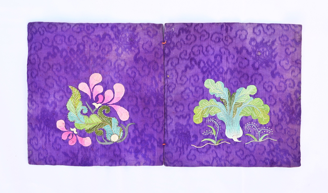 Pair of Antique Silk Embroidered Squares with Bok Choy and Peony in deep purple color background. Some fading on the silk. Late 19-early 20th century. Priced and sold as a pair.