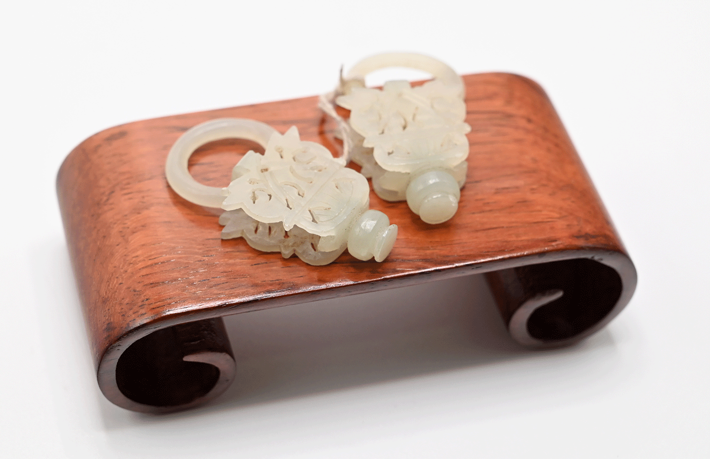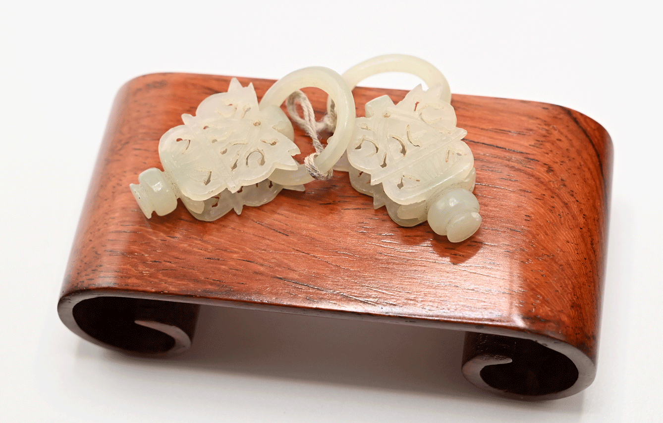 This small pair of Chinese white jade ornaments over 100 years old were hand-carved in layers and shaped like a flower basket for its auspicious meaning. The work is created with intertwined rings and is carved out of one piece of white jade stone. As a pair, they represent the meaningful wish for a harmonious relationship. Such ornaments might have been part of a larger work. From the late 19th to early 20th century at the end of Qing Dynasty.