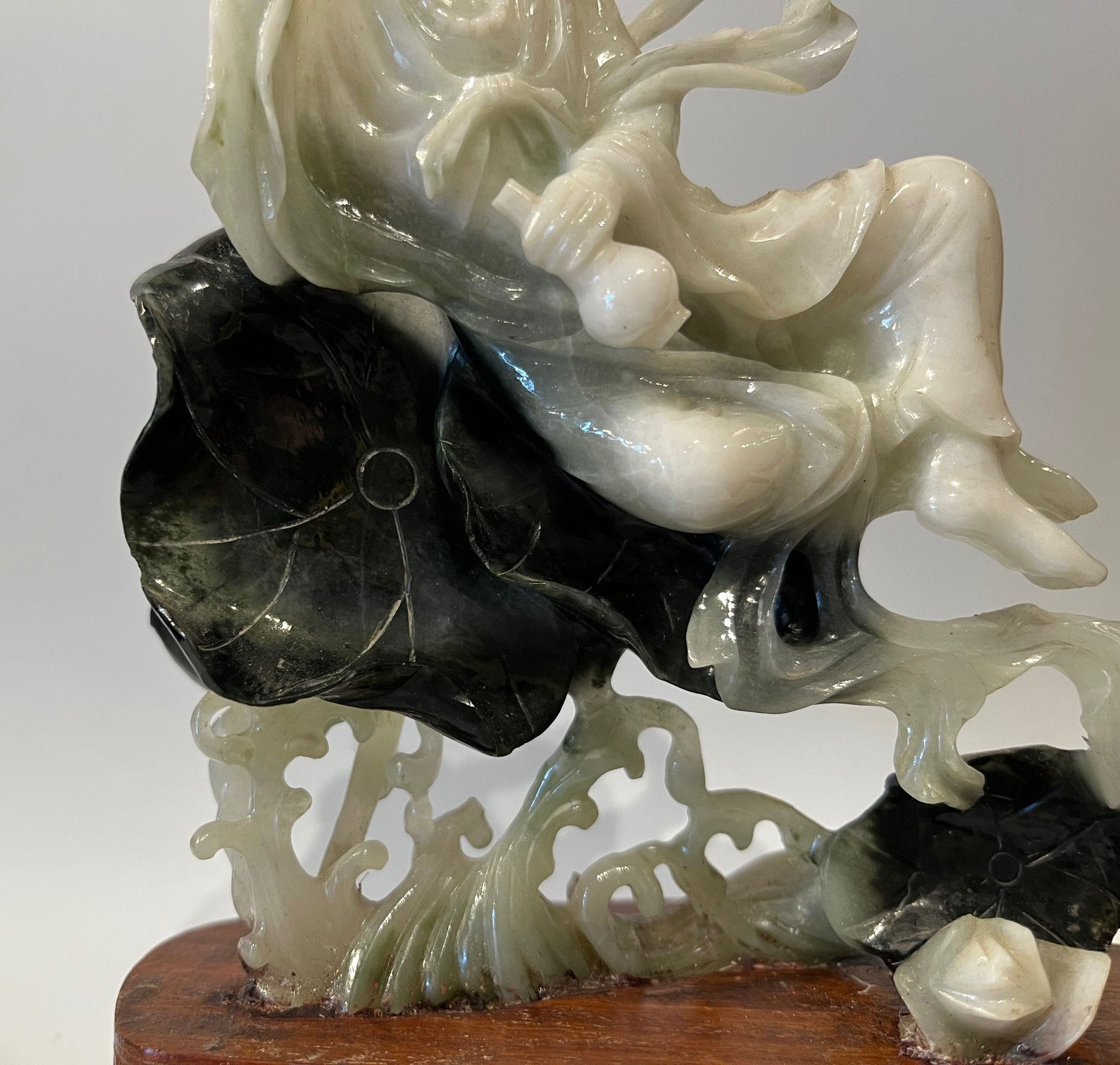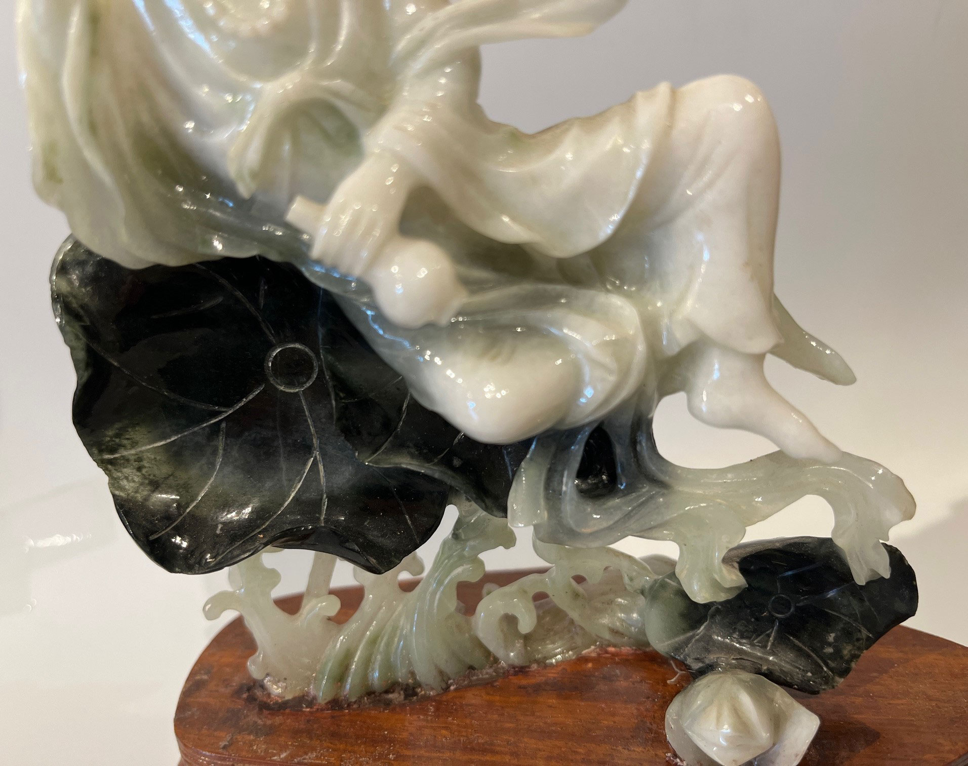 This intricately carved Quanyin statue sits on a large lotus leaf pad with intricate carved water waves below. In her hand, she holds a vase. Her eyes almost closed, in a resting position. This jade statue is hand-carved out of one large piece of jadeite. The carver cleverly used the different colors of the stone to create an appropriate and beautiful artwork according to the natural element provided by the stone itself.
