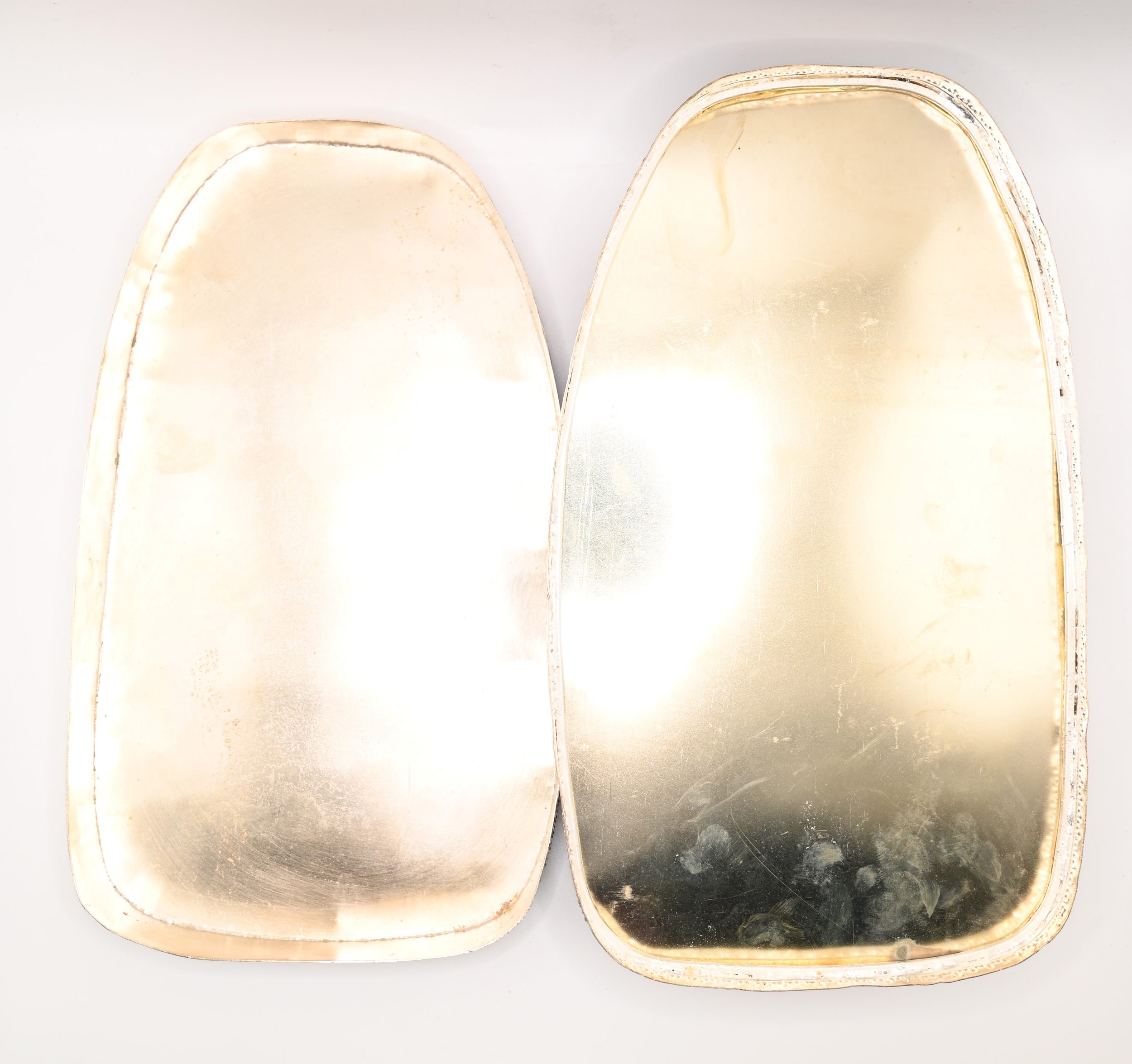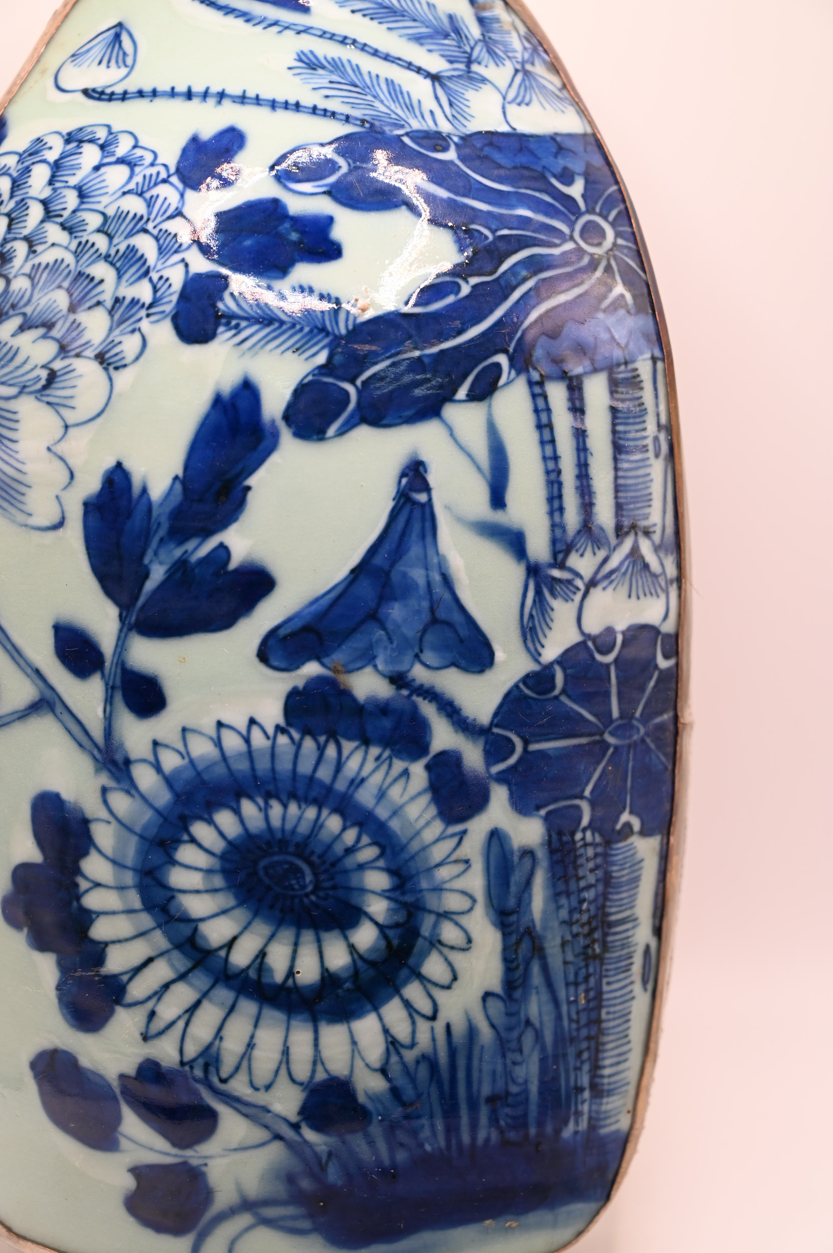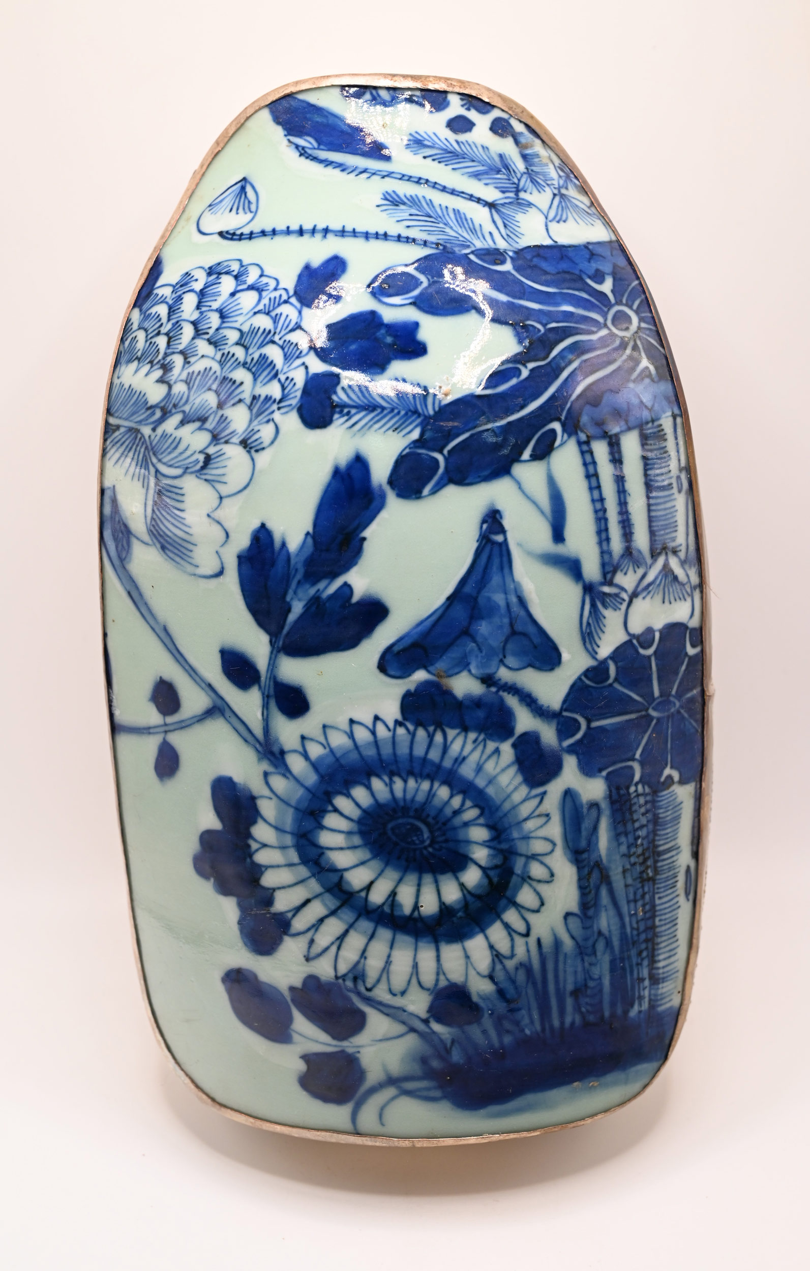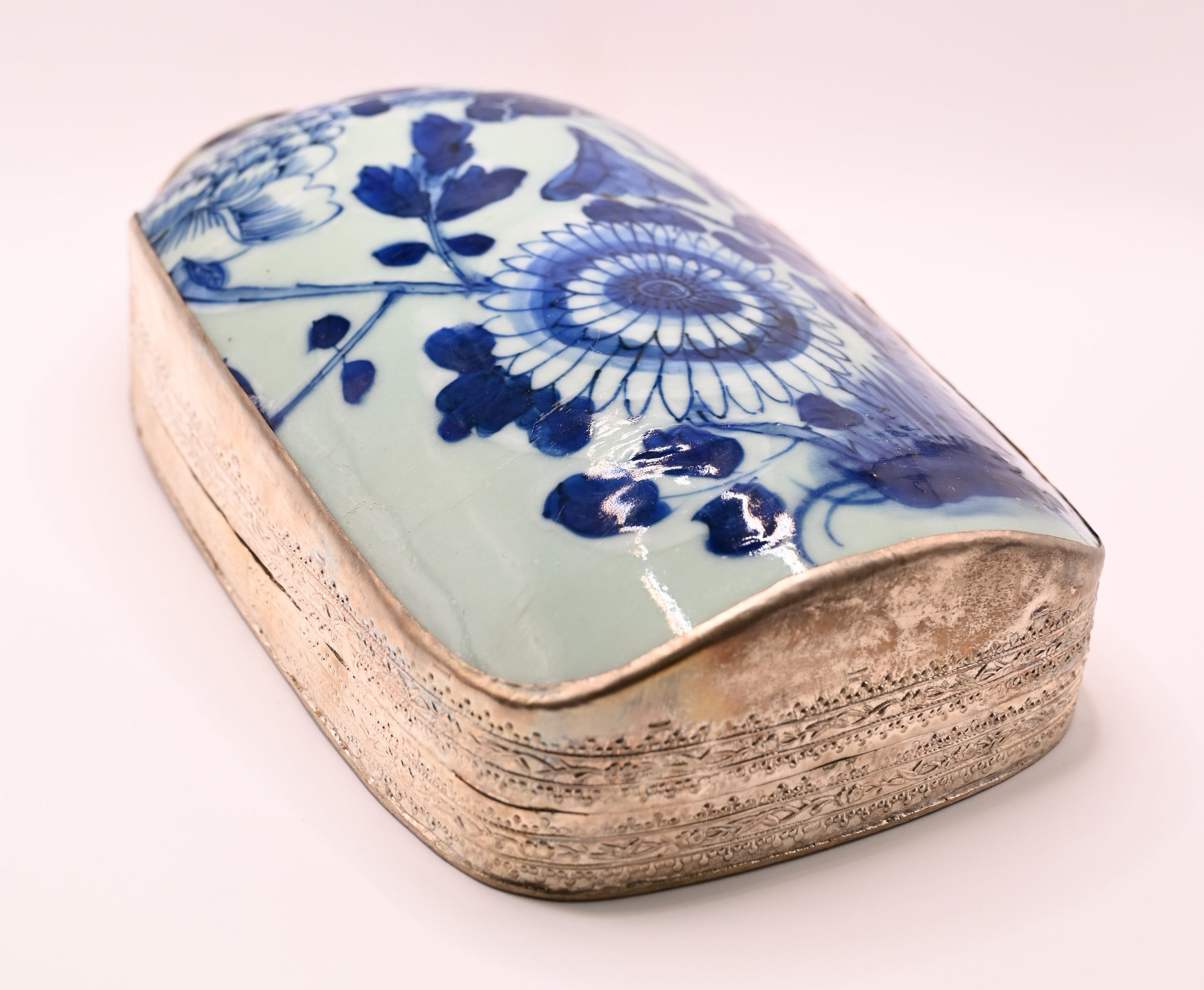 Ex-Large Size Silver-Plated Copped Shard Box w Antique Celadon-and-Blue Porcelain, Lotus. Over 100 years old.