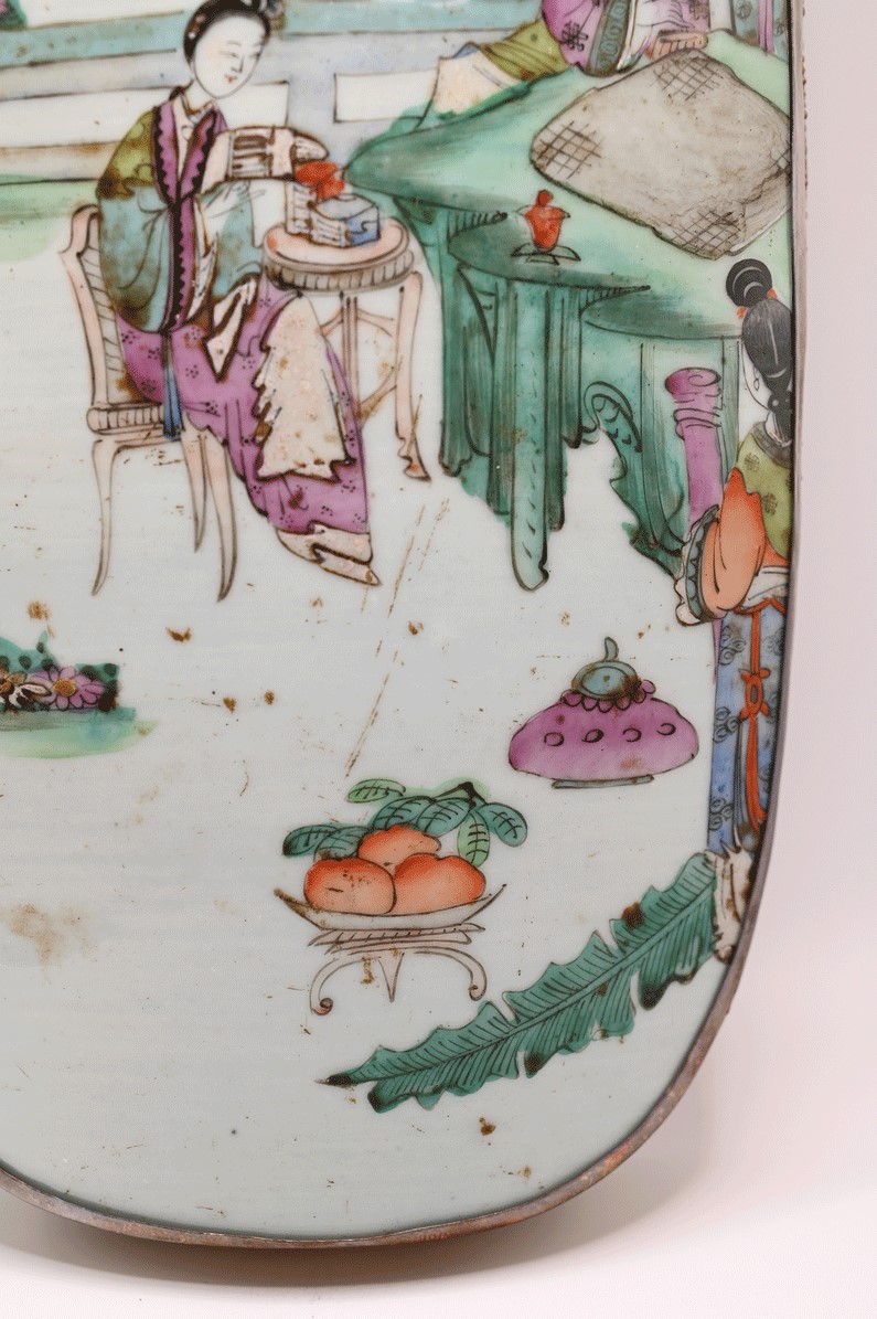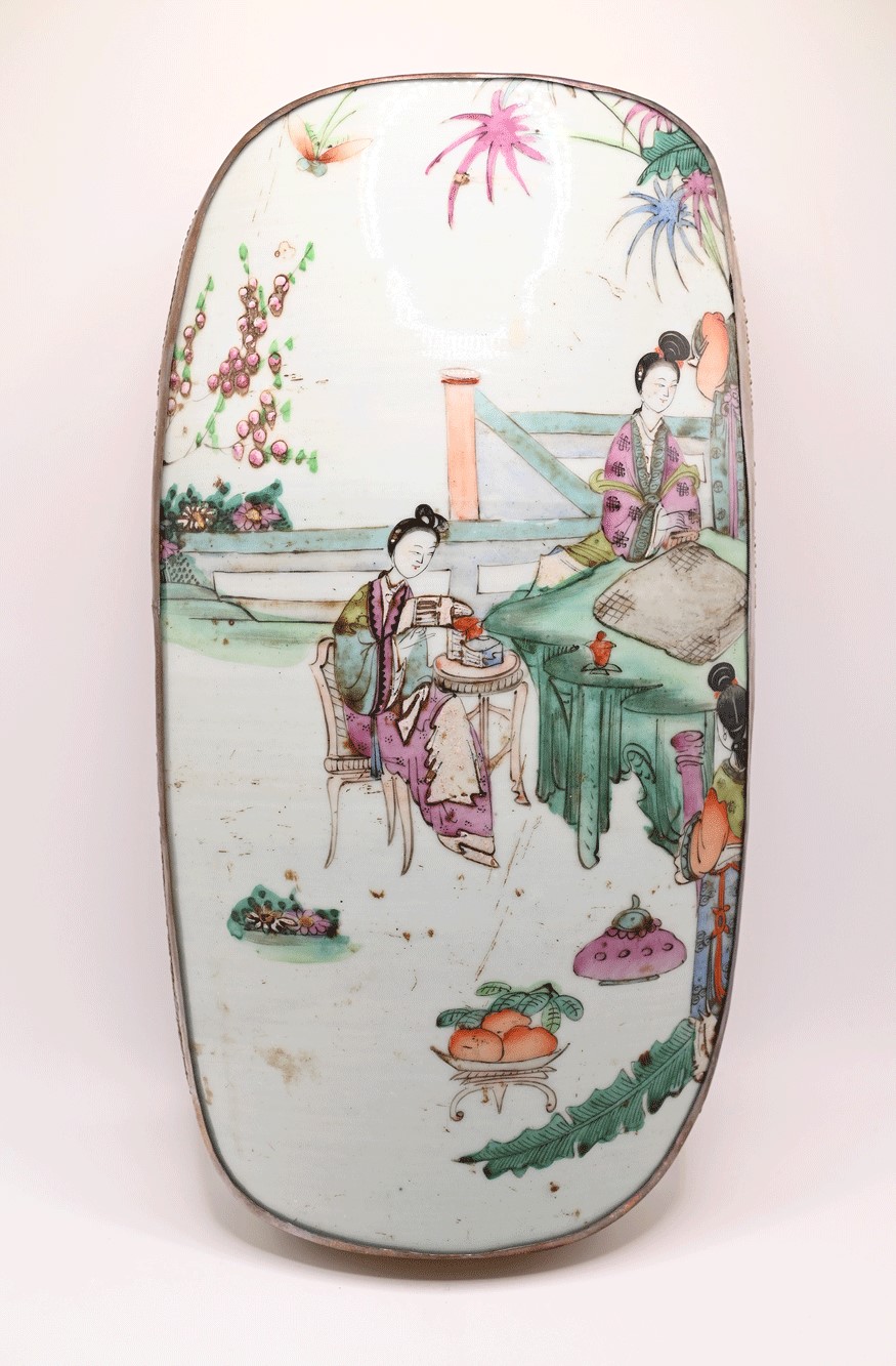 Ex-Large Size Shard Box with Antique Polychrome Shard, with three female friends enjoying various activities outside in a springy color landscape. Minor worn and scratches. A very beautiful one!
