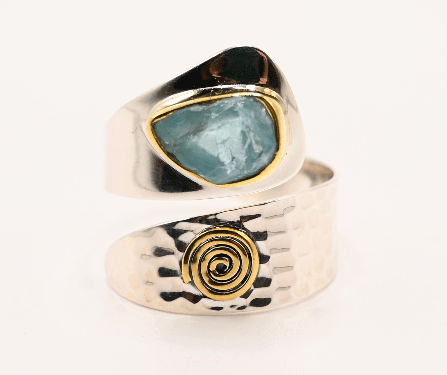 Hammered Sterling Silver Ring with Apatite Stone and Gold Accent. Size 9.