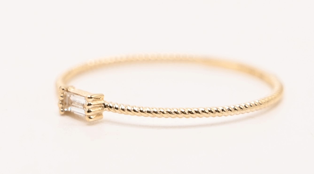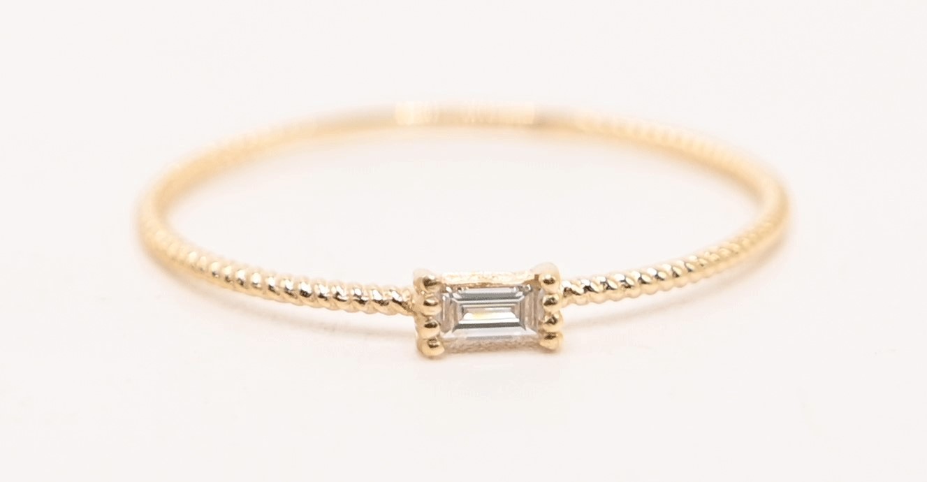 Product Description: solid 14kt gold; 4x2mm natural white diamond baguette (VS/1 quality); twisted ring band (0.9mm ring band thickness)