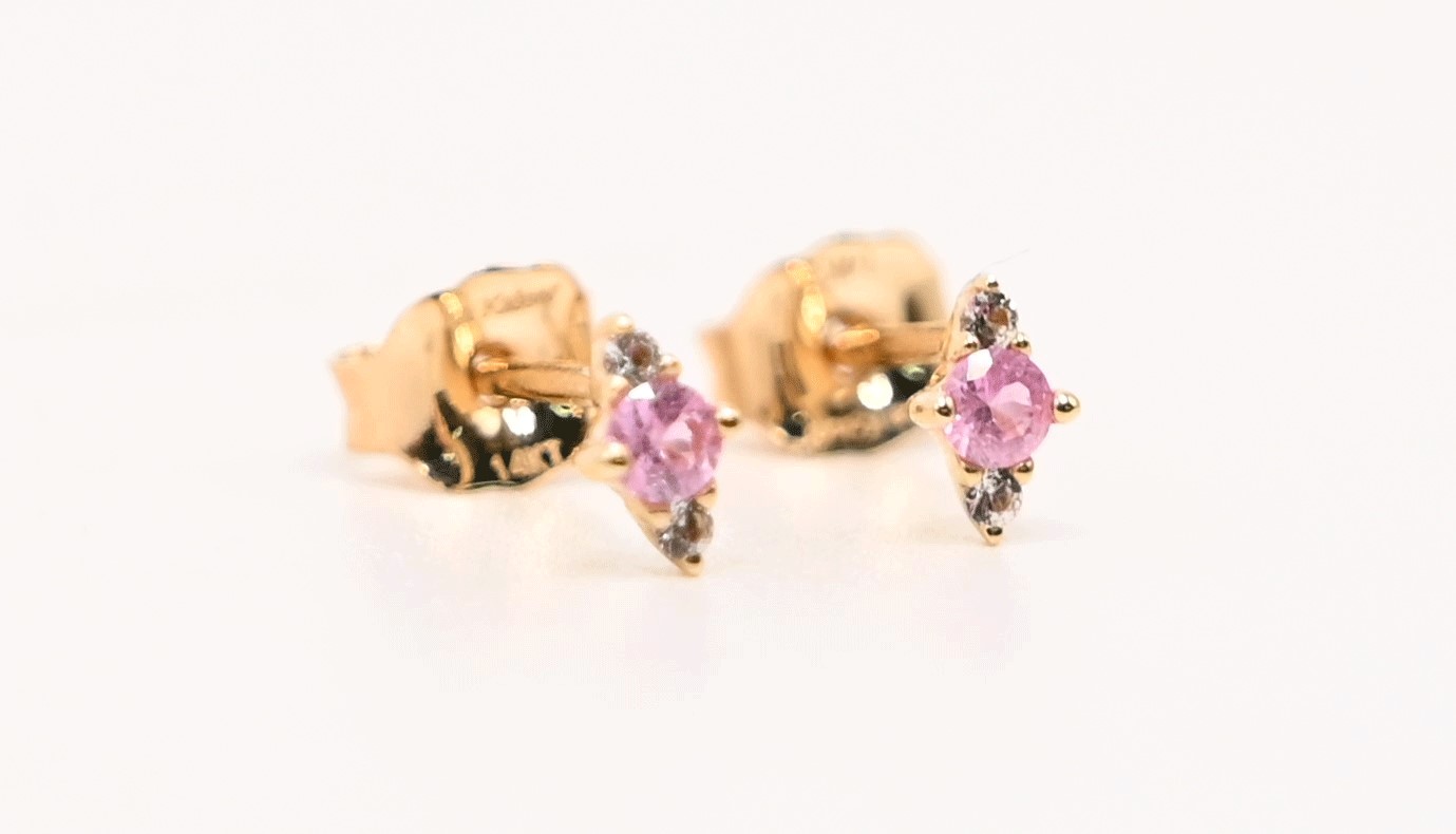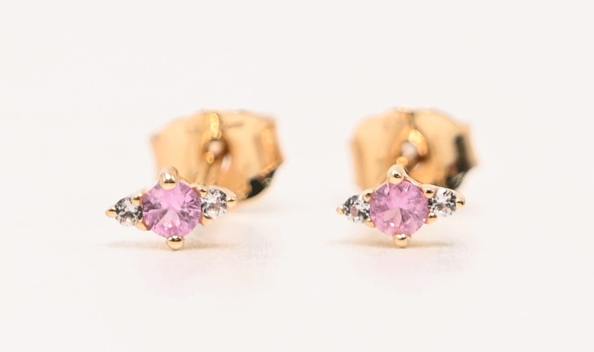 14K Solid Gold Dainty Triage Stud Earrings with Natural Pink Sapphire. Natural 2mm & 1mm pink sapphire