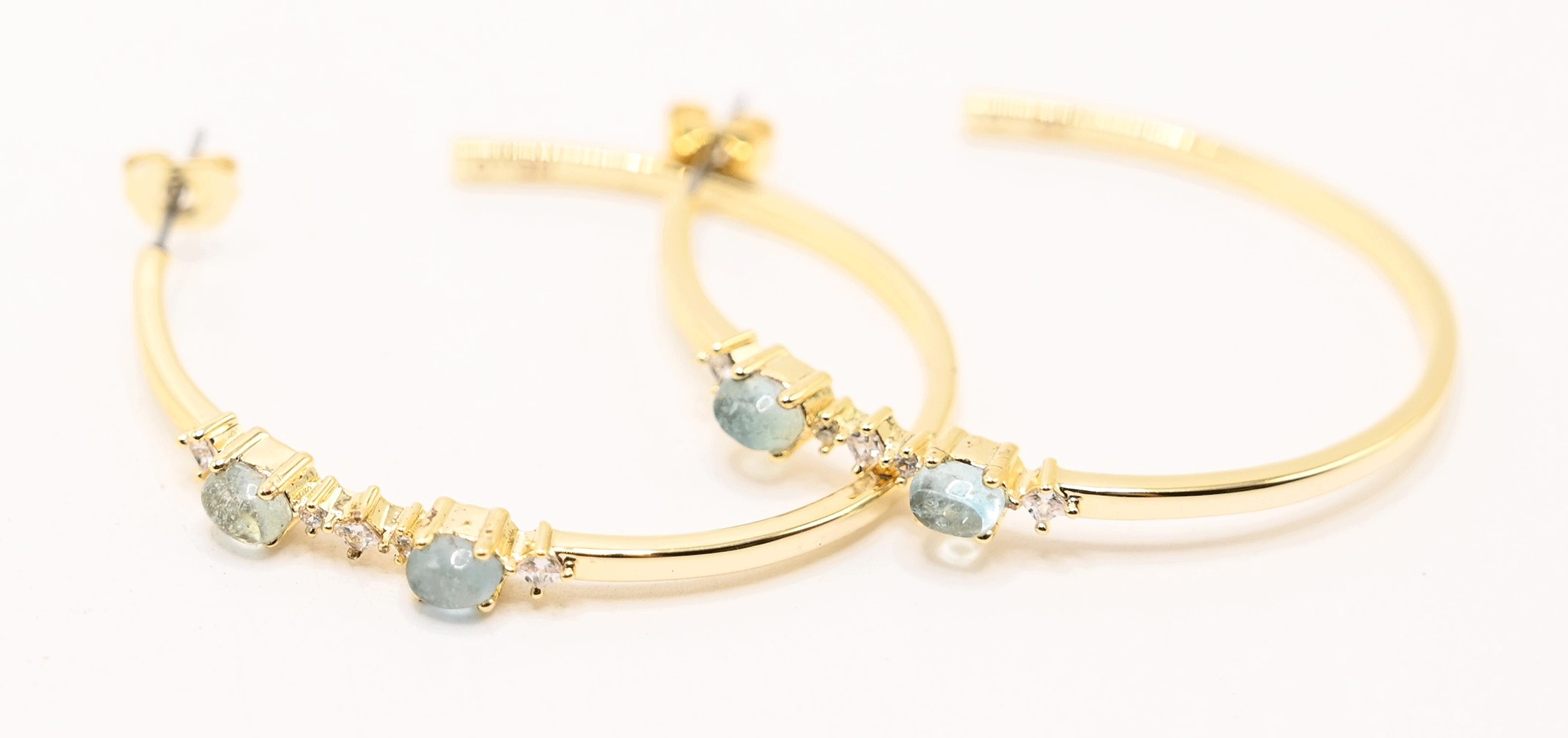 #29577 14K gold-Plated Brass Large Hoop Earrings with Natural Aquamarine Stones