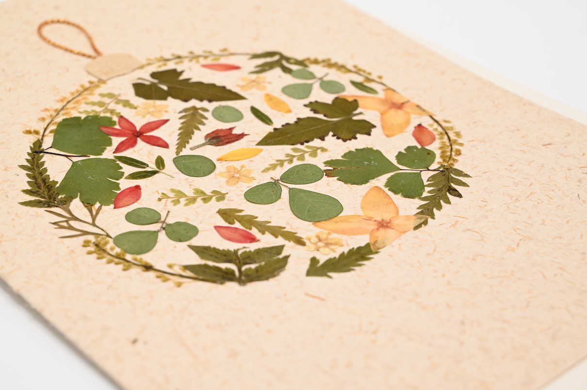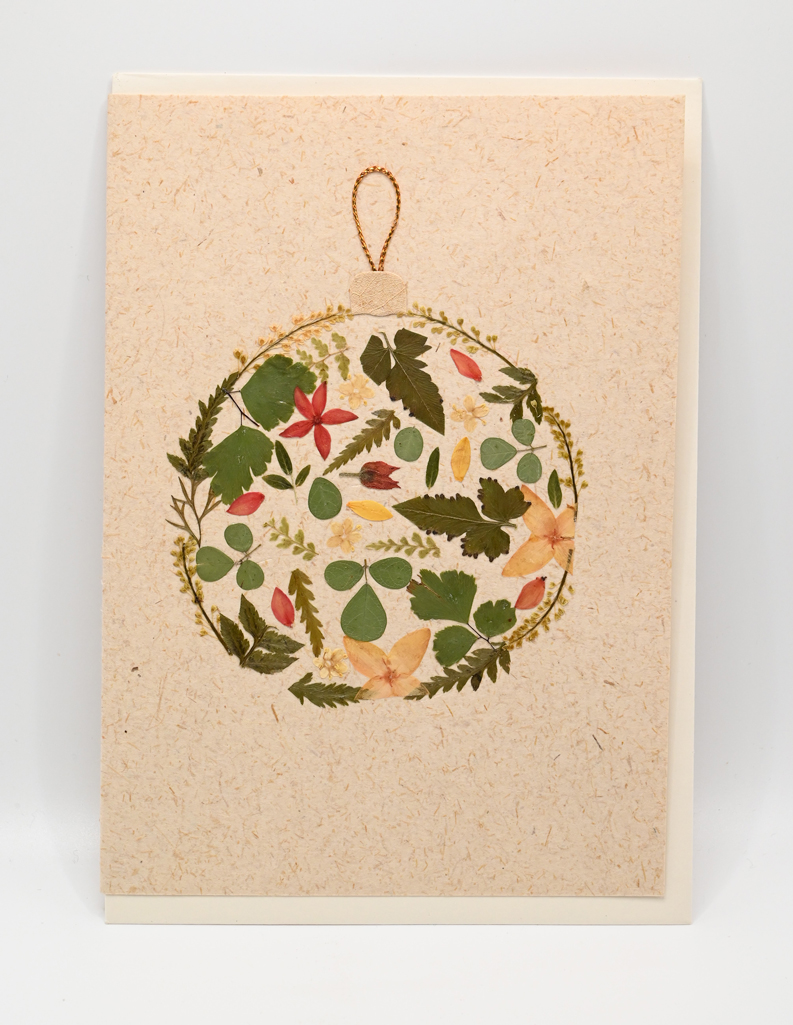 Send the beauty of nature with every holiday wish. This beautiful greeting card features a delicate circular ornament made from real dried flowers, ferns and leaves; each one a miniature work of art. The ornament is finished with gold metallic paper and thread, giving it a festive, elegant touch. Made with natural cream-colored handmade paper, the card showcases organic textures and subtle fibers, creating a warm, earthy feel that’s perfect for the season. Comes with a coordinating tan envelope, a gold seal, and a protective sleeve, this gorgeous card is ready to gift or mail with love. Blank inside for your personal message. The Ten Thousand Villages logo and brand statement are imprinted on the bottom half of the back of card.