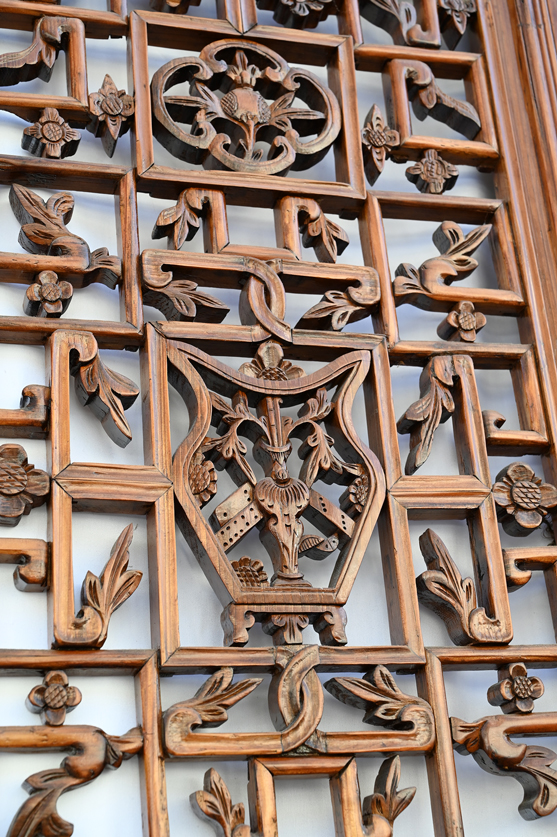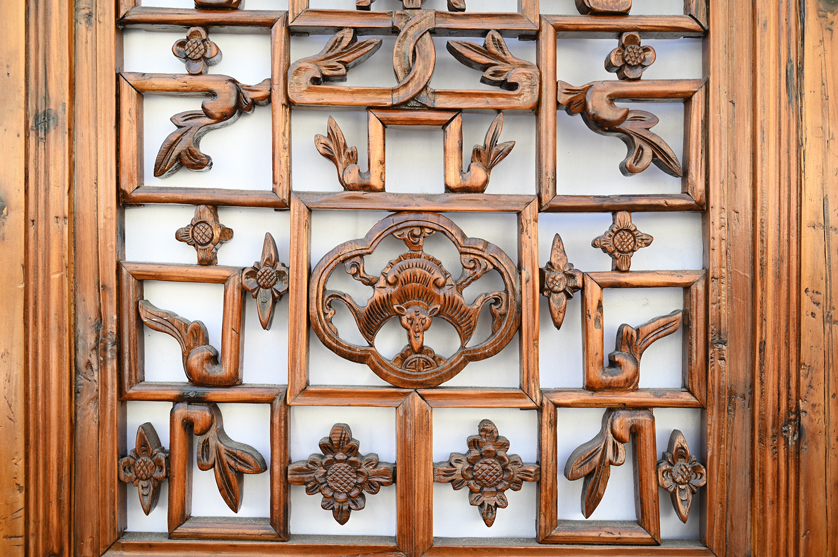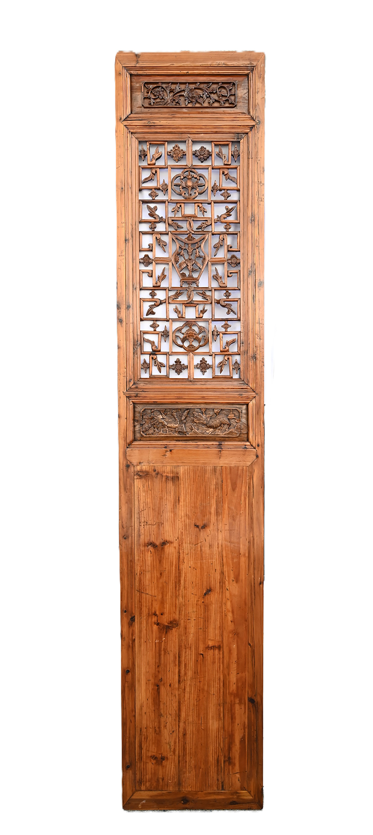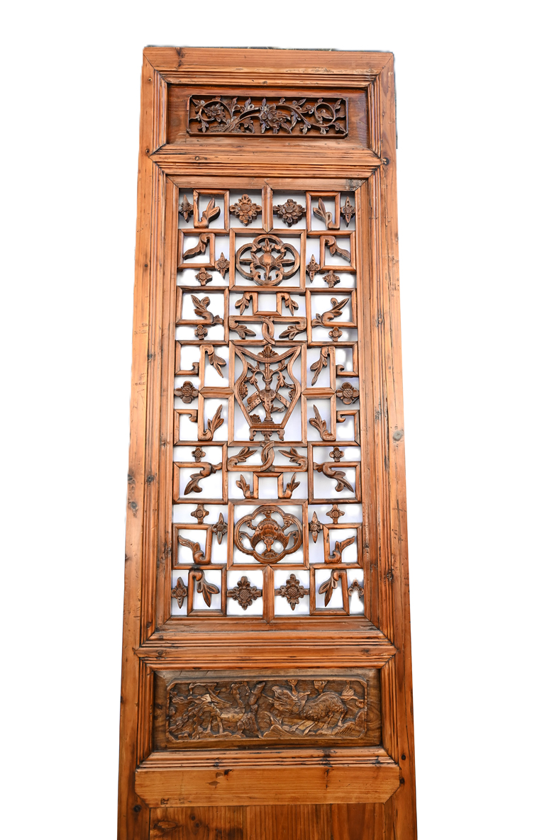 17-18th century carved tall screen lattice door with hand-carved motives in bat (good luck & longevity), longevity peach, and flower vase (vase is pronounced as Ping, meaning "Safety" or "Harmony") with different vegetation and flowers. The latticework is composed of stylized Key shape design with minimized dragon tail design. The small lower panel on this one is carved with the mythical Chilin and phoenix, interacting with each other. This wonderful carved screen door full of auspicious motives and beautifully carved objects from the nature has been refinished on both sides with layers of hand-polished natural lacquer from the lacquer tree and is ready to hang or display at your beautiful home! Priced for each screen. Three of these screens are available, can be purchased as a set or individually. Price shown is for one.