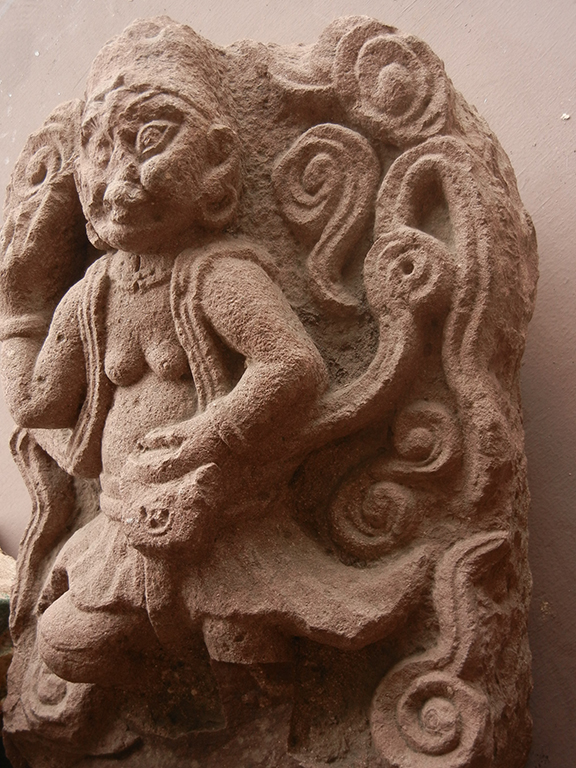 This very rare and interesting ancient Chinese stone statue shows a non Chinese figure possibly from a foreign country or from a tribe. The figure has pierced ears, and wears big loop earrings, bracelets, and necklace. Each hand appears to be holding an object. The top of the body is naked, draped over by ribbons. The figure wears a short skirt and, although broken on one knee, looks to be in a kneeing position. The sides of the figure are carved with more ribbons and cloud like motif. This piece possibly has come from the south-western China.