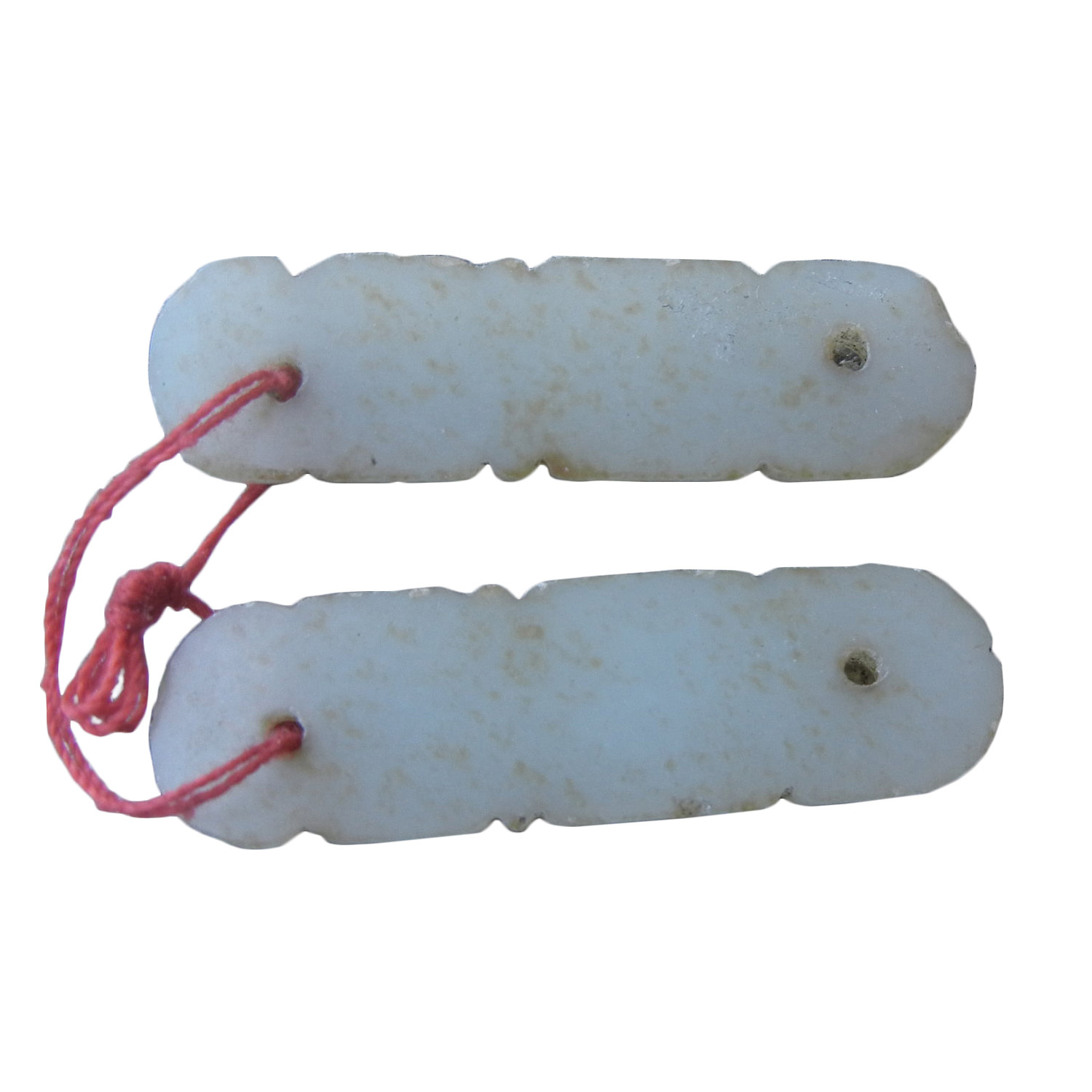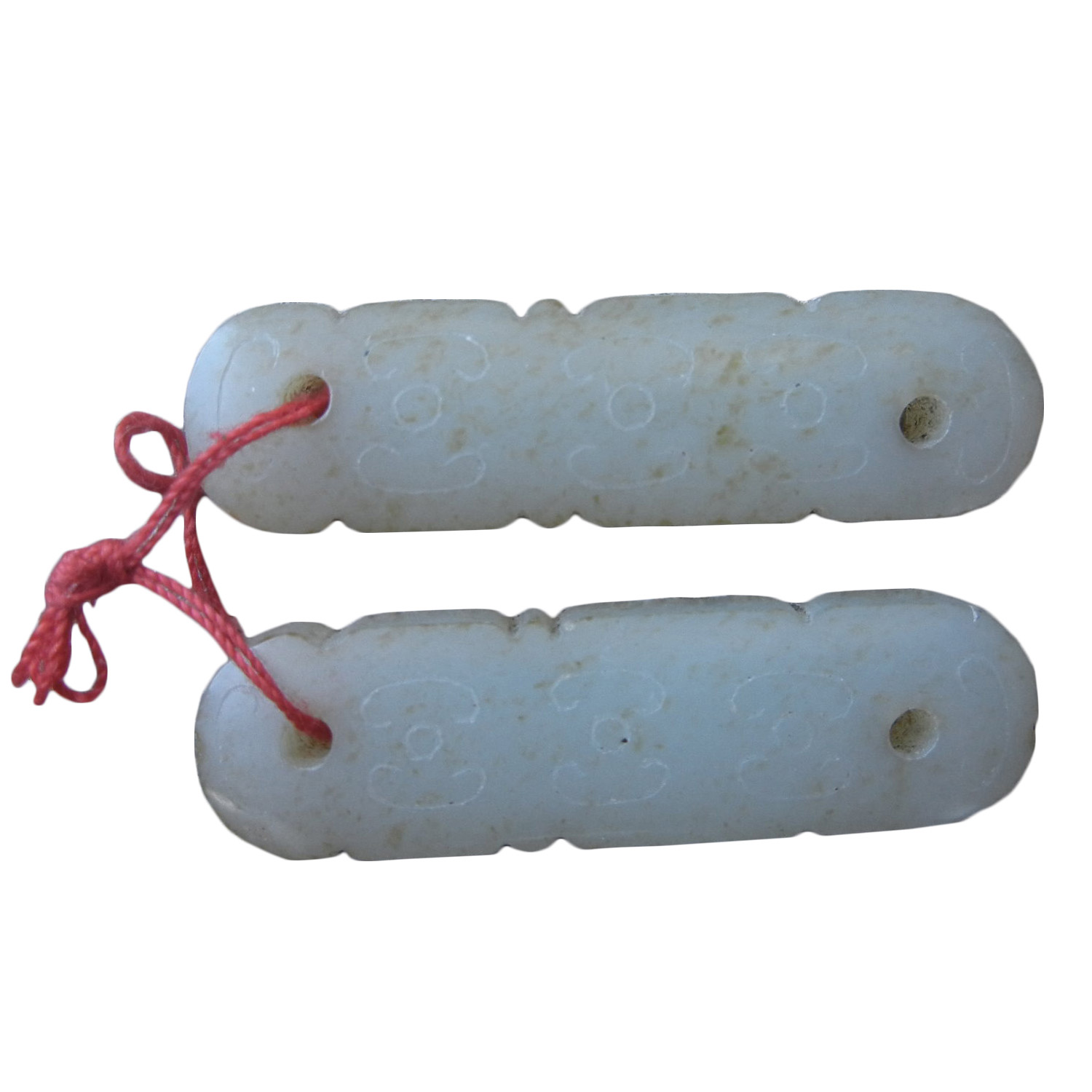 This authentic pair of antique white jade ornaments are carved with small Ruyi-like circular patterns with a ribbed design at the edge.