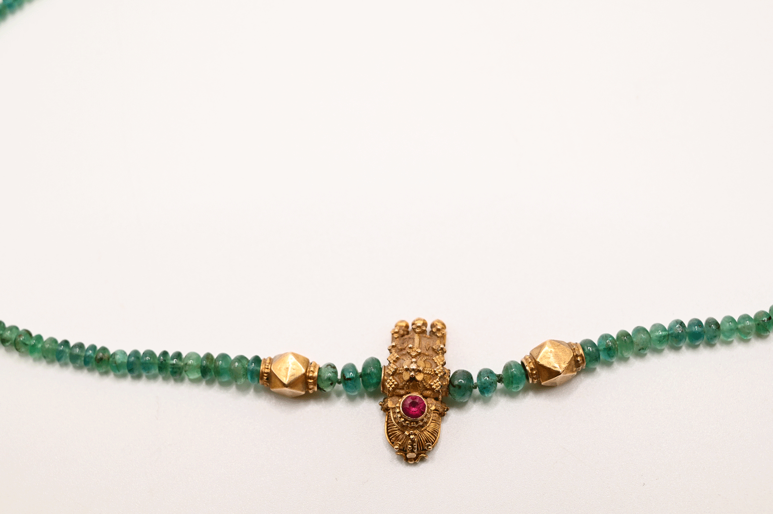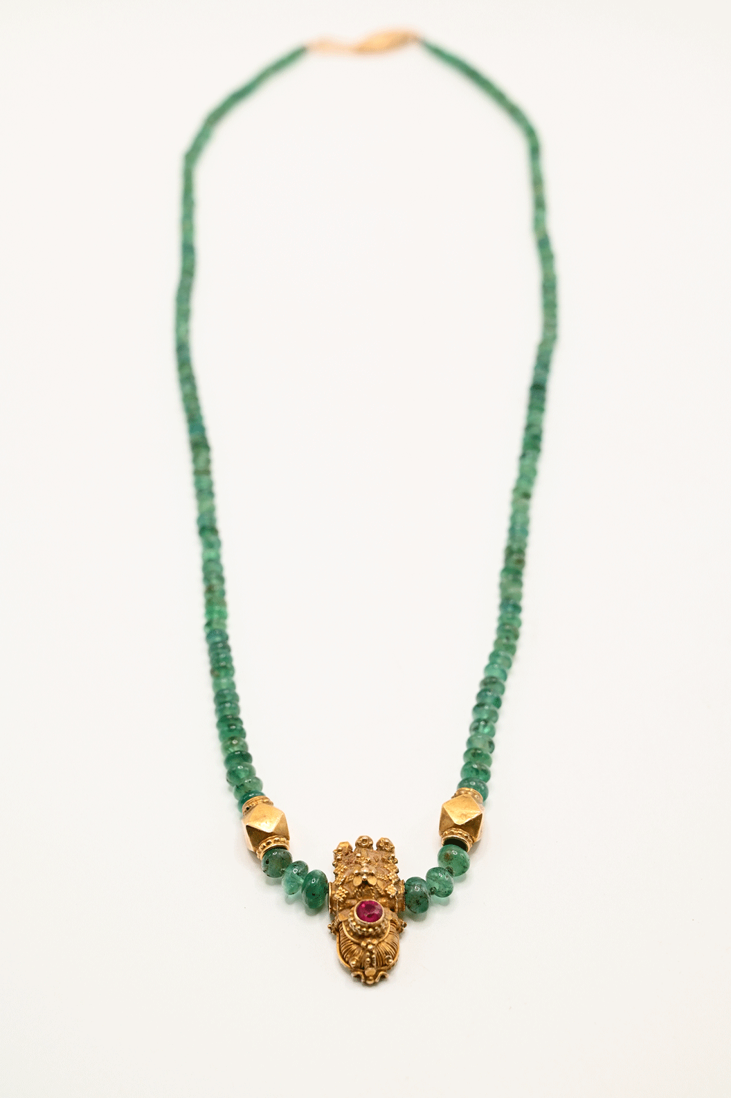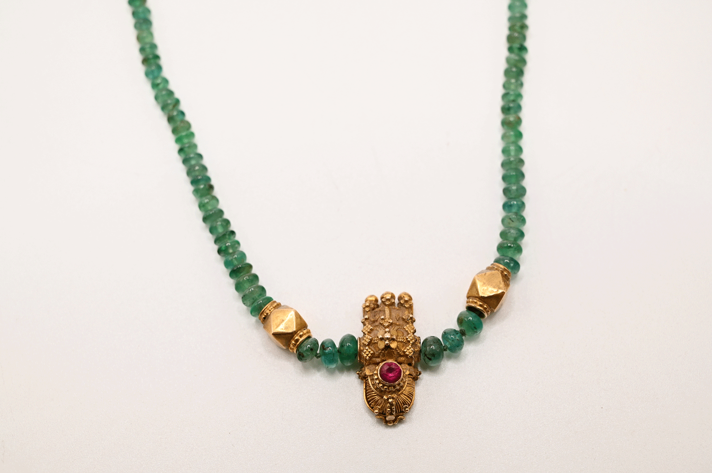 #20999 Necklace with Emerald Beads and Antique Indian 24k Gold Ornaments (February Sale)