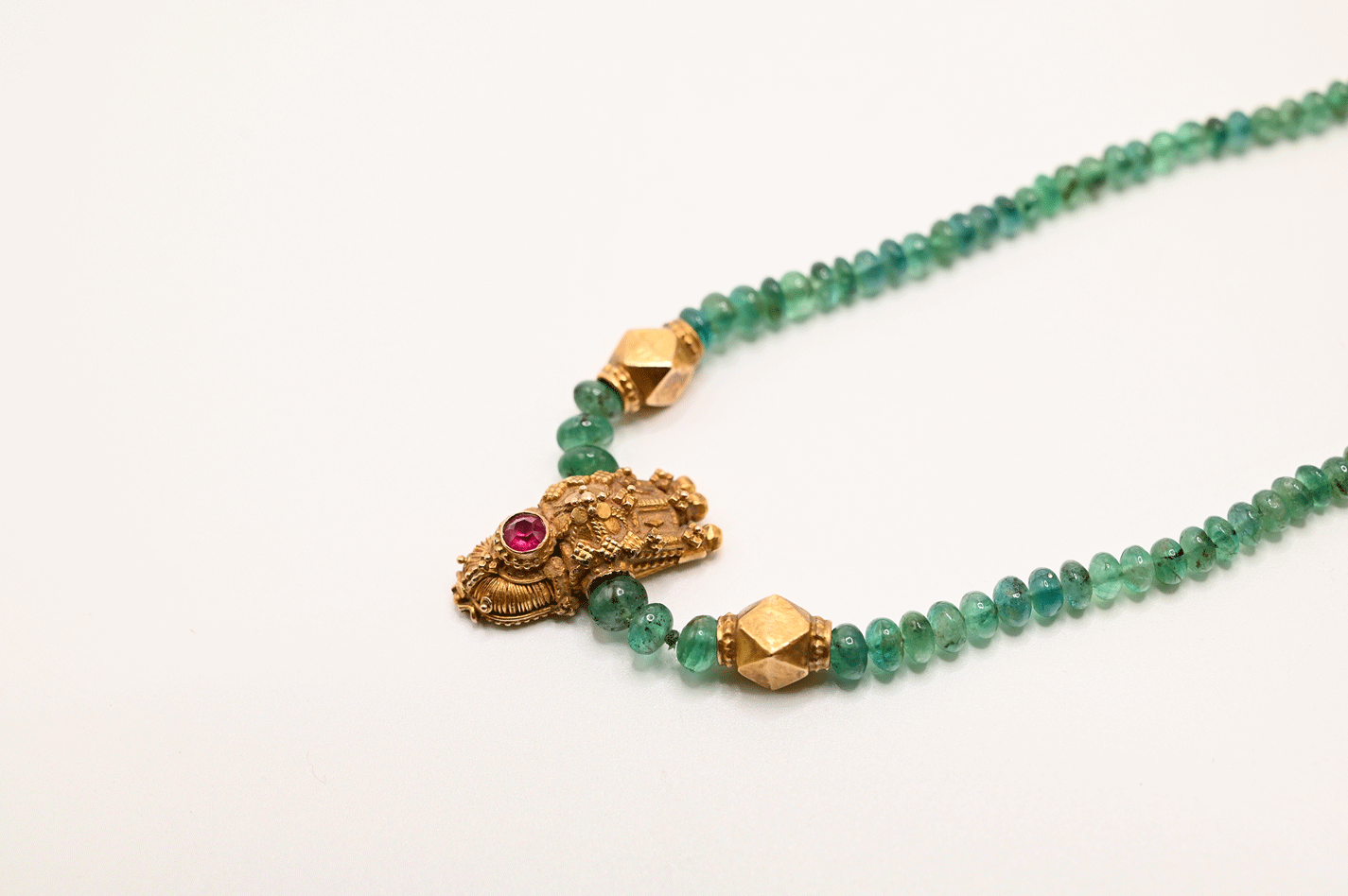 Necklace Strung with Emerald Beads and Rare Antique Indian 24k Solid Gold Work of A Dragon and Old 24K Gold Beads. With modern 14k Gold Clasp. The incredibly intricate solid 24k gold dragon ornament is over 100 years old and decorated with what looks to be a small ruby. The two antique 24K Gold Beads are also over 100 years old and are said to be given to a bride for wedding by parents. This piece offer exceptional workmanship with timeless beauty. it is a wonderful investment piece. Please inquire about price.