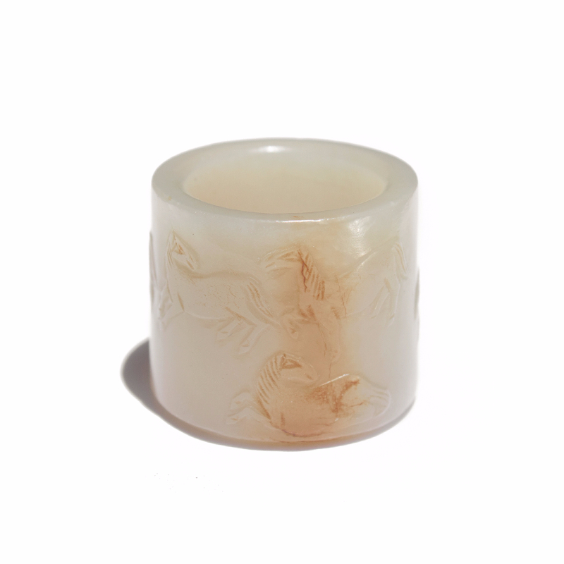 This unusual antique Chinese white jade archer's ring is carved with an “Eight Horses” scene with russet color. Eight Horses is a popular Chinese art motif with the most famous paintings of eight horses by the famous Yuan Dynasty calligrapher and painter Zhao Mengfu (Chinese, 1254–1322) as well as the 18th century Italian artist, Giuseppe Castiglione, who served as an imperial painter for the Qing court. An archer's ring with carved eight horses is not commonly seen.
