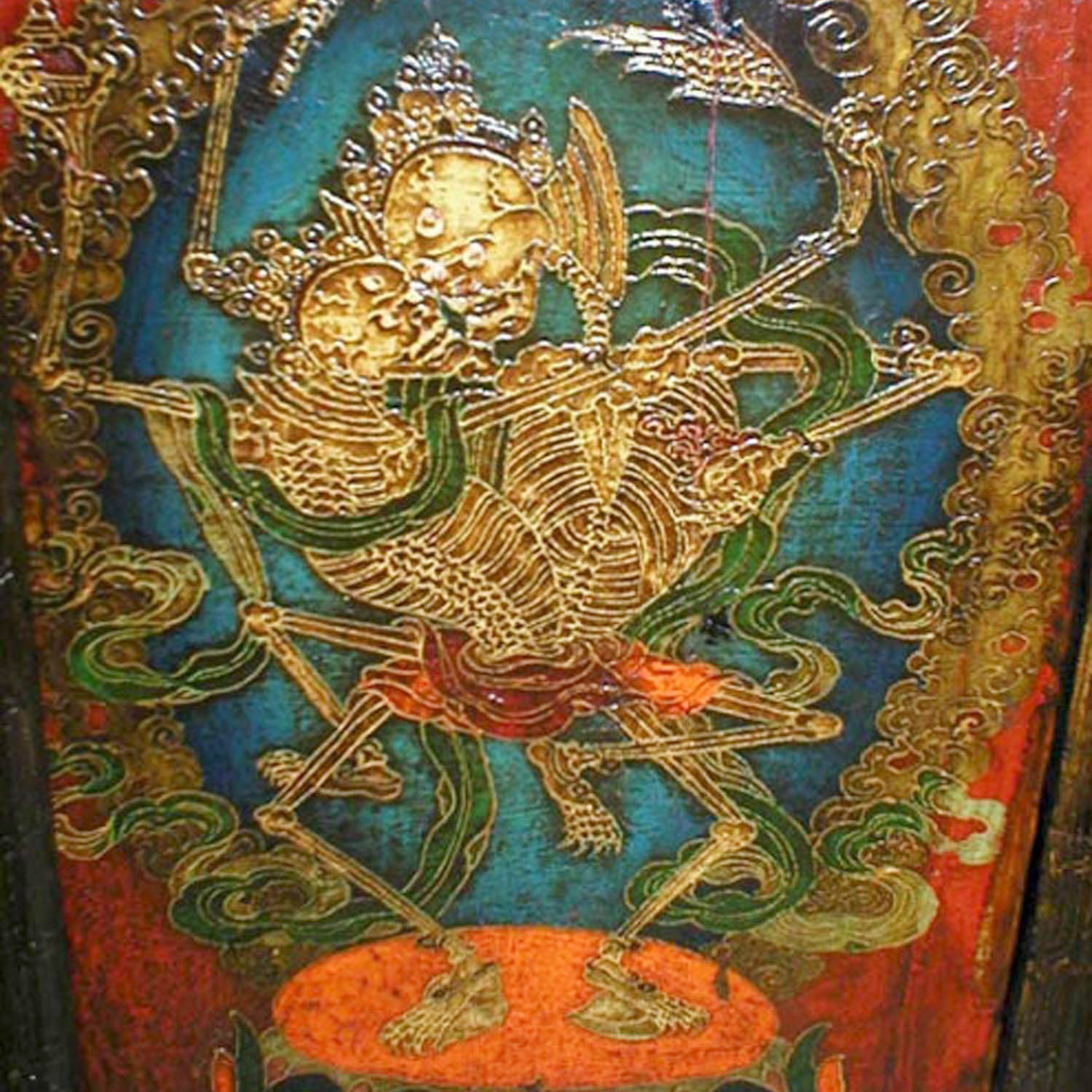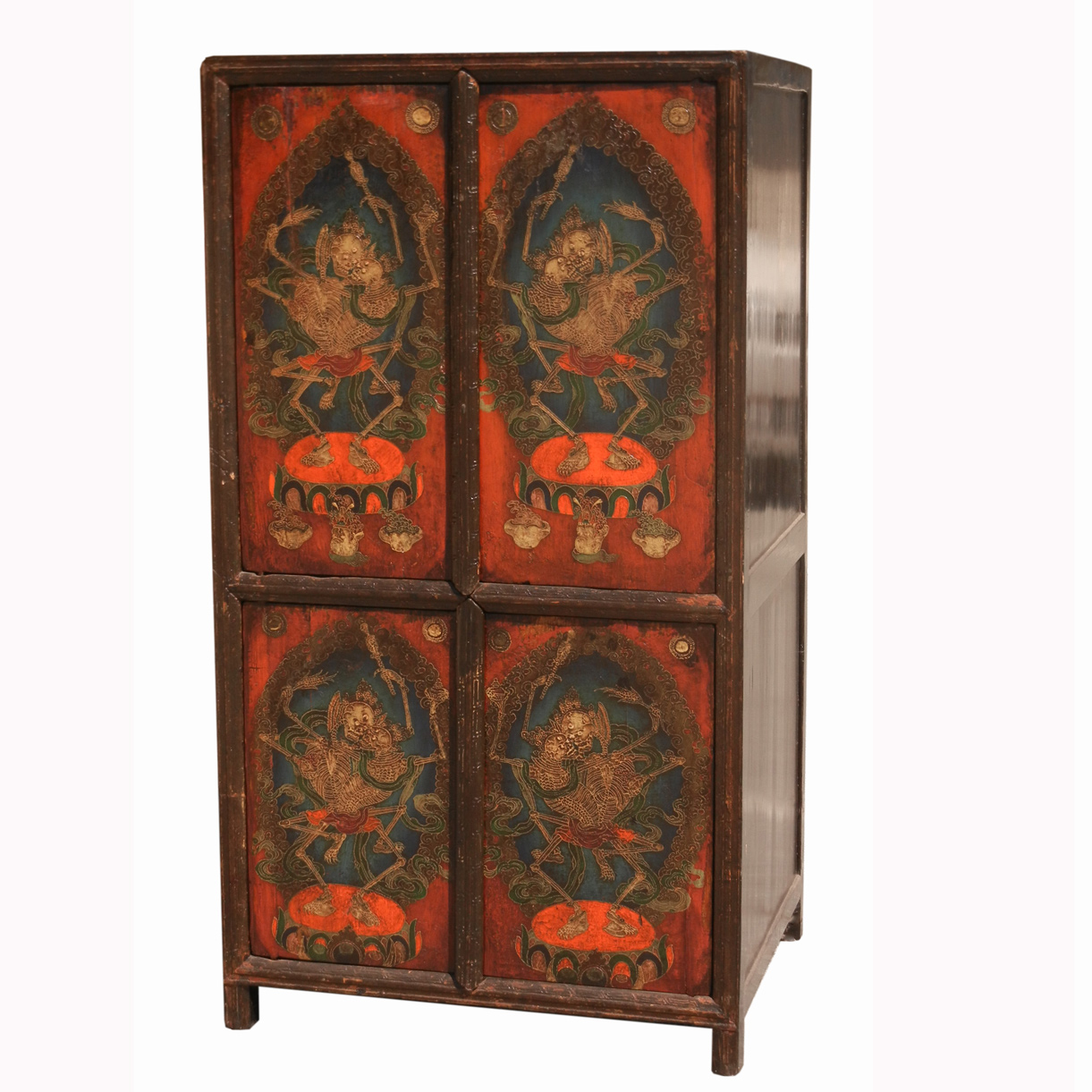 Very rare 18-19th century Tibetan cabinet with original painting of Citipati image. We were told that this image was normally concealed by a hanging cloth, only during an important ceremony can a lama see the image. This cabinet was used for storing ceremonial utencils. It has been restored. Although reproduced items with this image can be seen, antique piece like this one is extremely rare. This piece is by far with the finest painted image of its type we have seen.