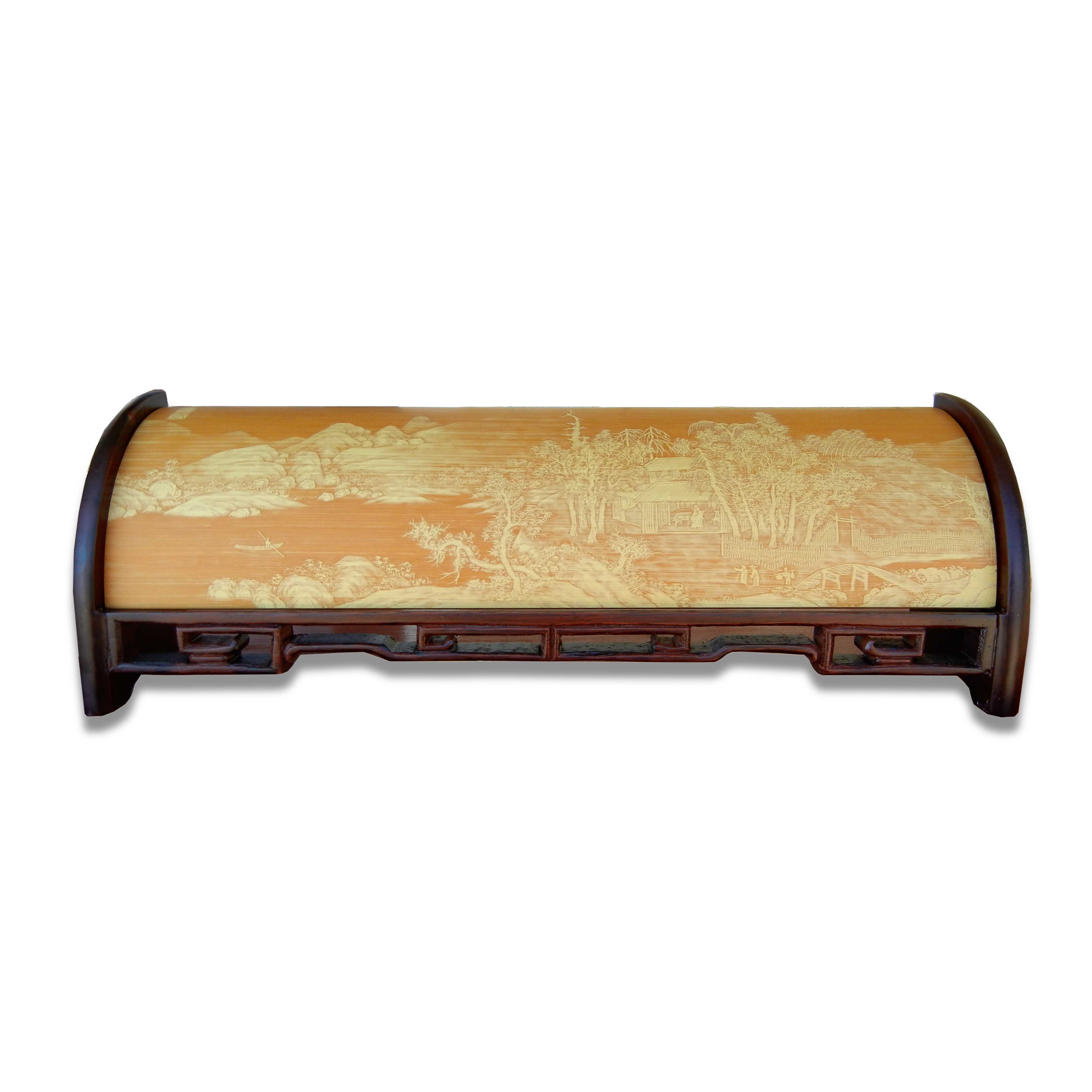 New large carved bamboo calligraphy-writing wrist rest made with Hong Mu hardwood display stand. Damaged.