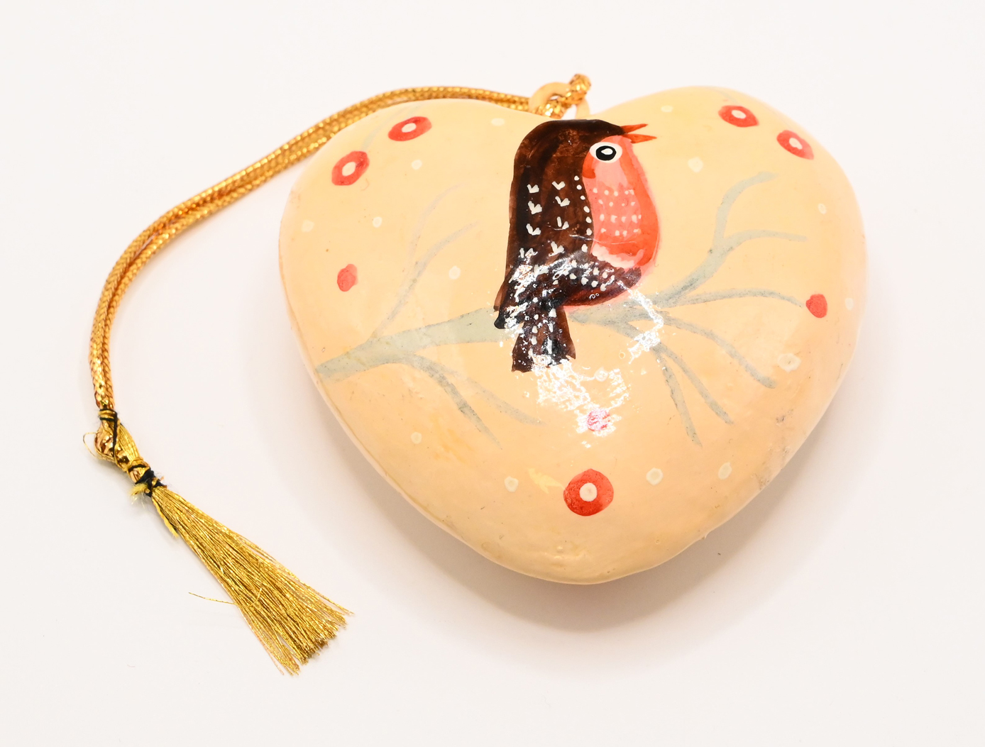 Hand-Painted Holiday Heart Shape Hanging Ornament with Bird from India.
