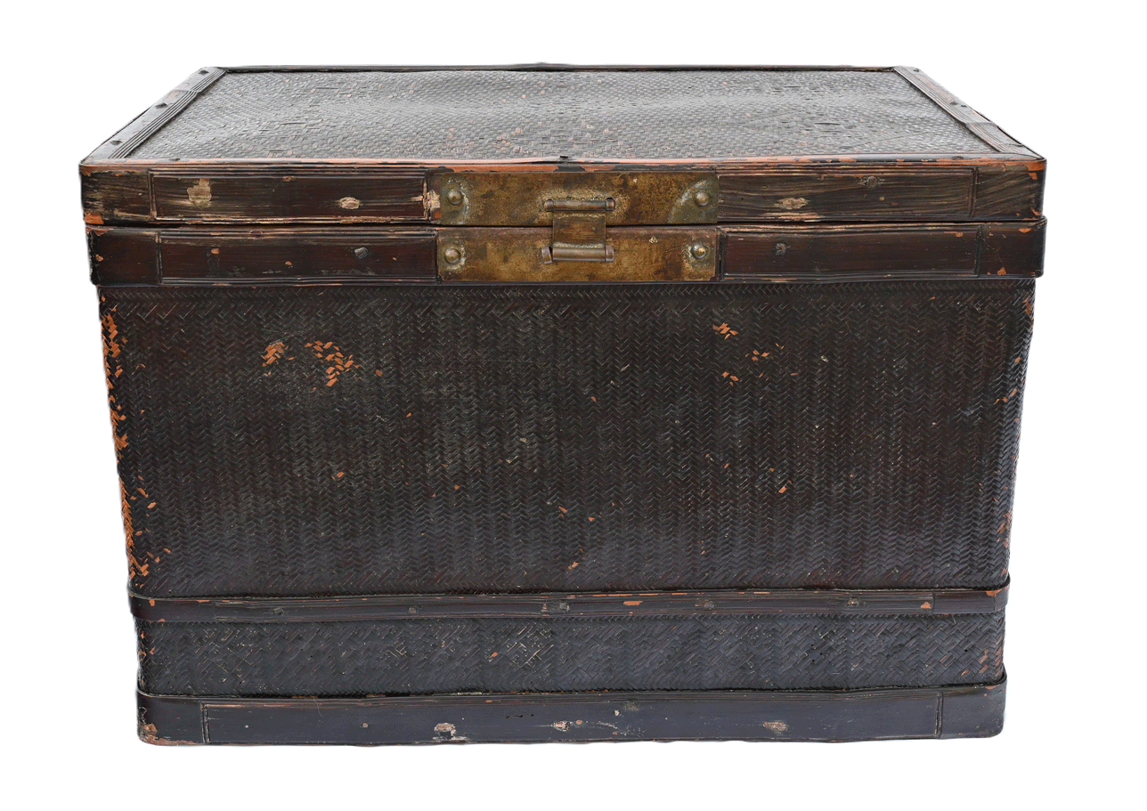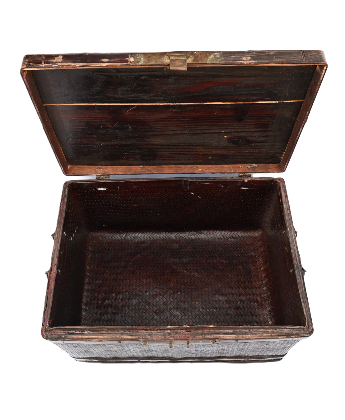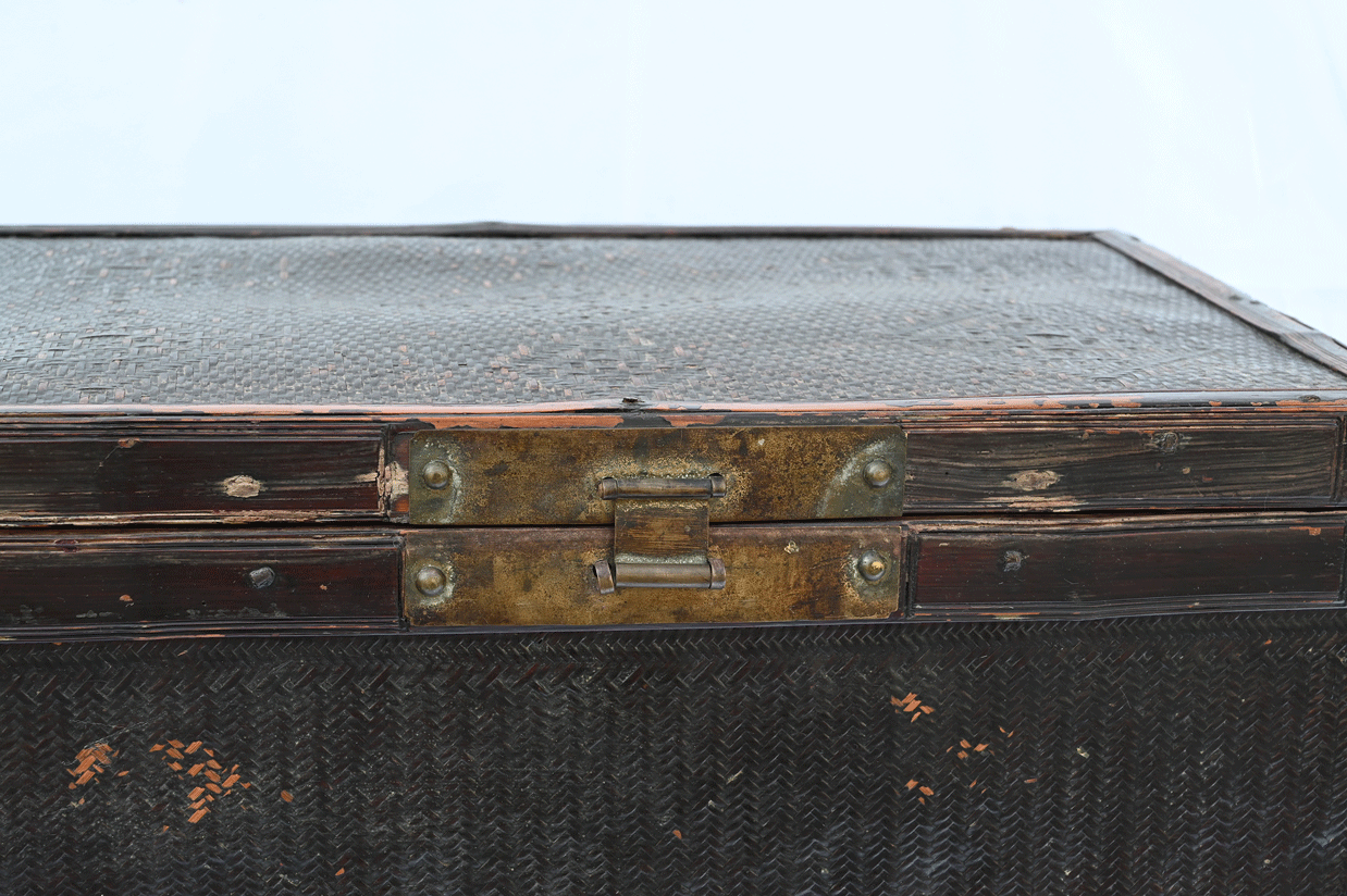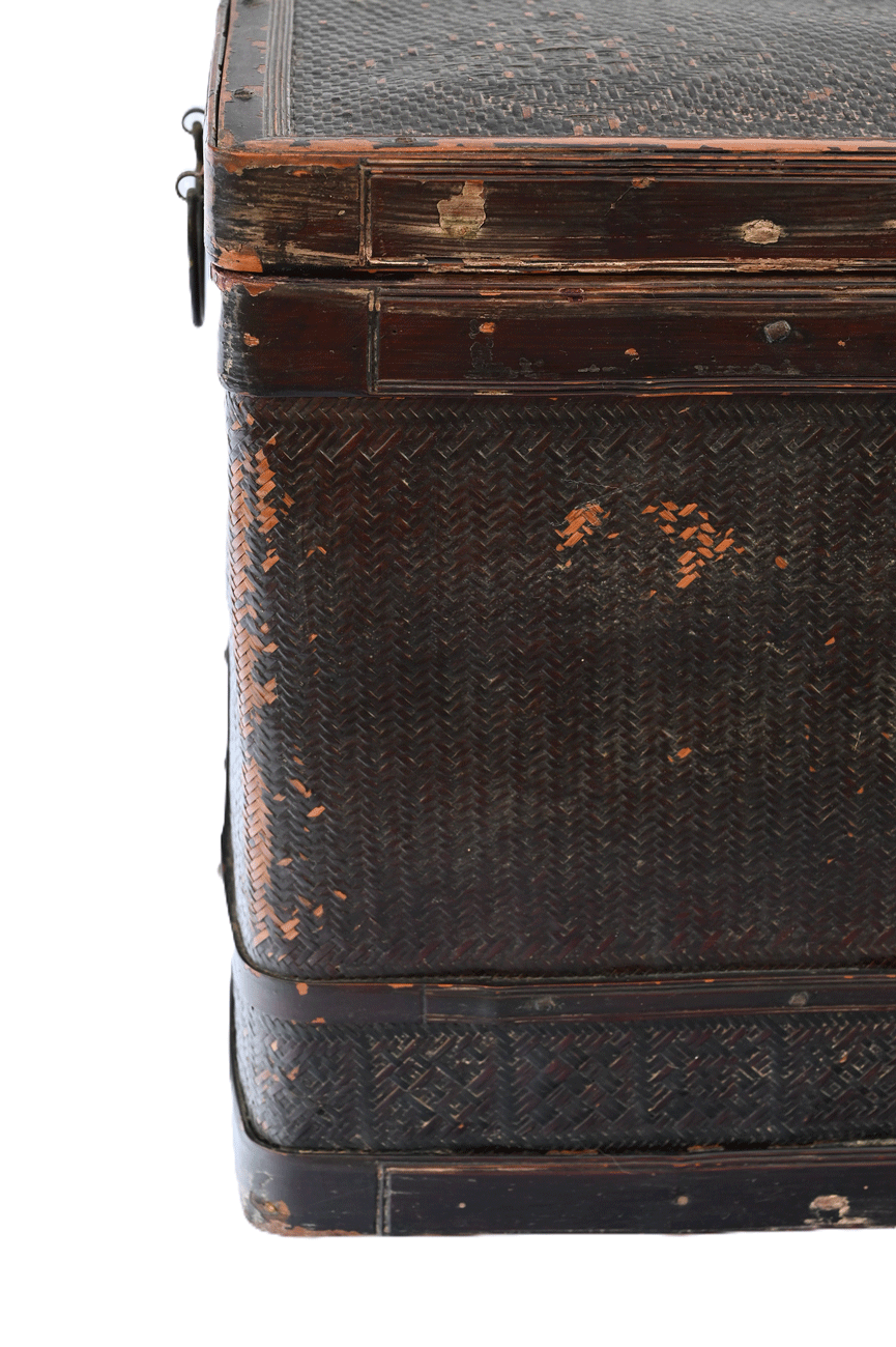Large size antique book storage chest/trunk with woven bamboo and old brass handles; with intricately woven bamboo patterns on the lid and on the chest, all covered in the original old black lacquer. Such book chest was said to be used for storing stacks of rice paper bound manuscript books in the Ningbo/ Zhianf-zhe area in China. Late 19th - early 20th century.