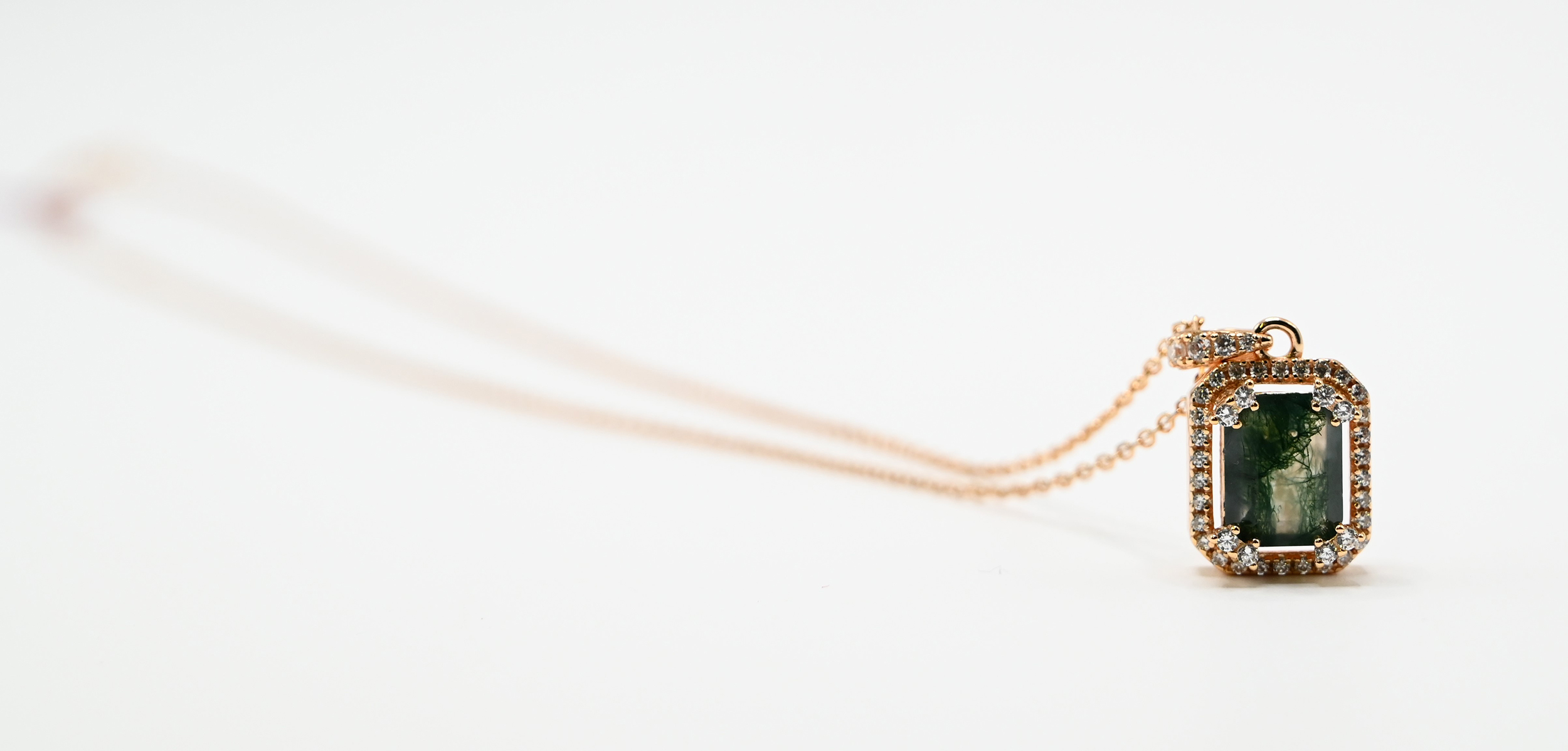 Glod-Plated Sterling Silver Necklace with Moss Agate and Zircon Pendant.